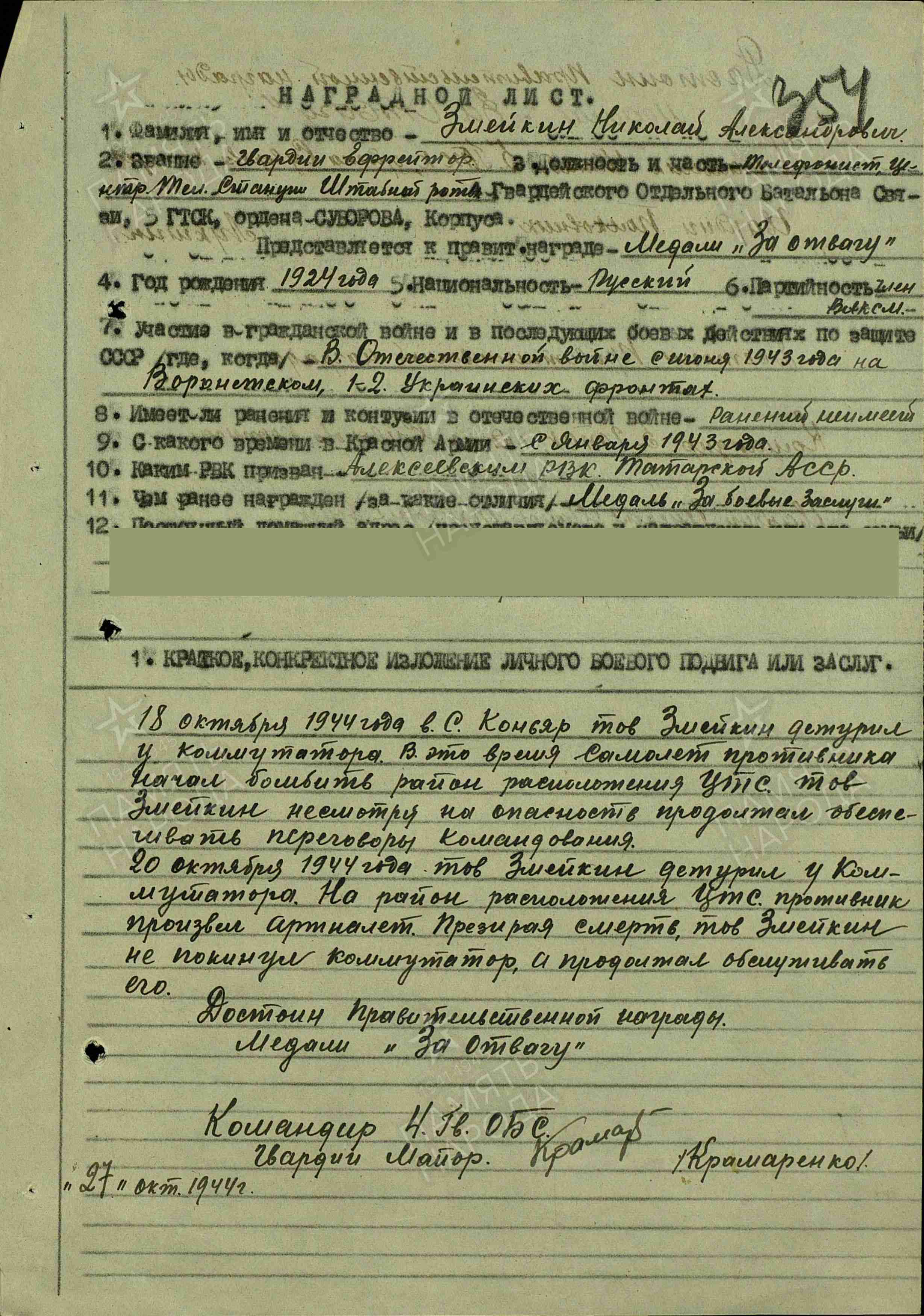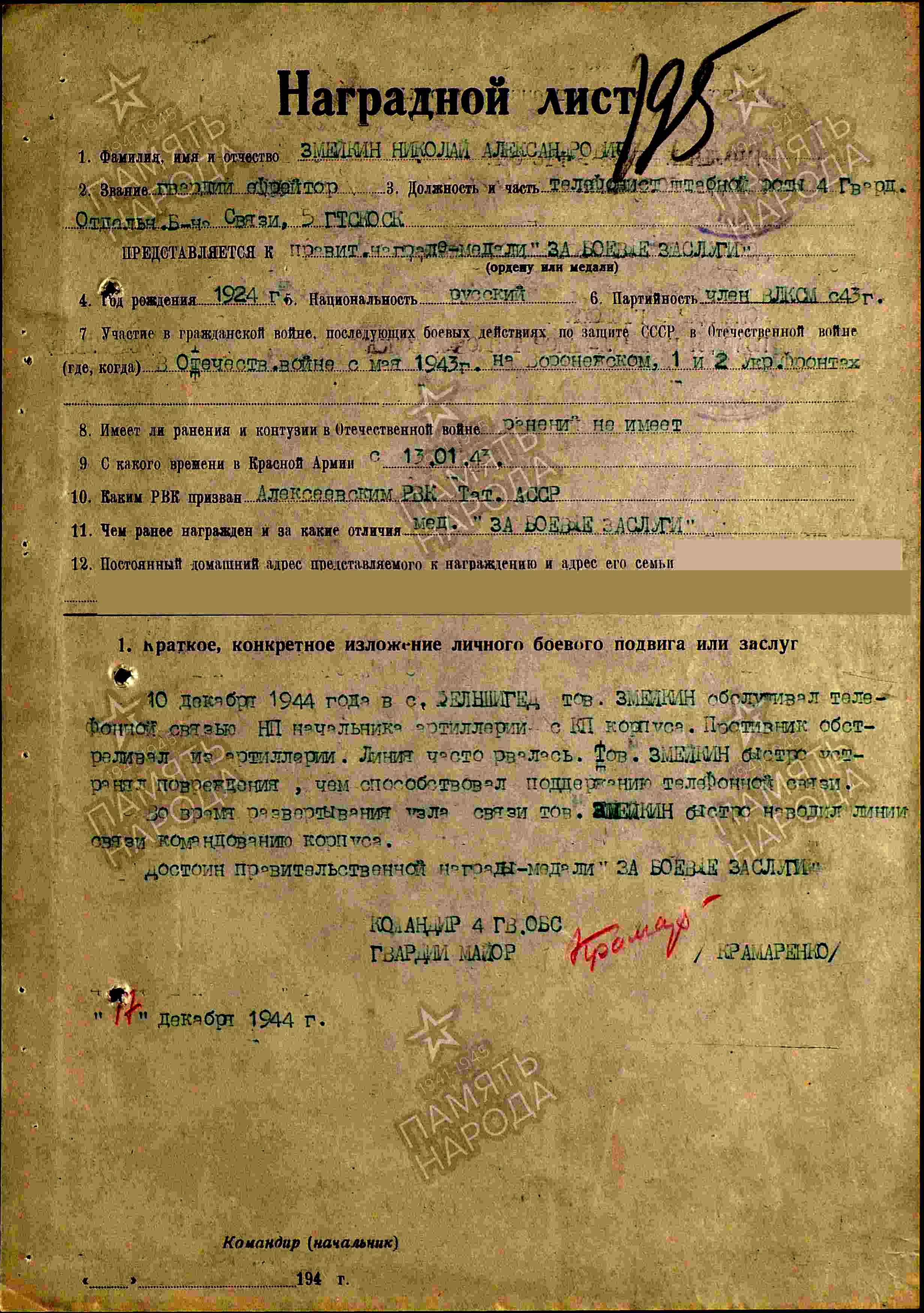 ЗМЕЙКИН Николай Александрович, 1924, уроженец Лаишевского р-на, жил в с. Алексеевское. Член ВЛКСМ. Мобилизован 13 янв. 1943 Алексеевским РВК. Гв. ефрейтор, телефонист штабной роты 4 отд. гв. батальона связи 5 гв. ТК 6 гв. А Воронежского фронта, 38 А 1 Украинского фронта, 6 ТА 1 и 2 Украинского фронта, 6 гв. ТА 2 и 3 Украинского/ Забайкальского фронта. Награждён двумя медалями «За боевые заслуги», двумя медалями «За отвагу».