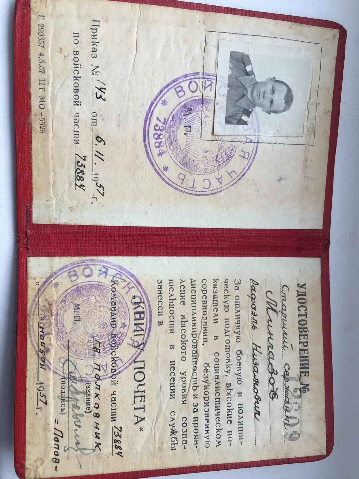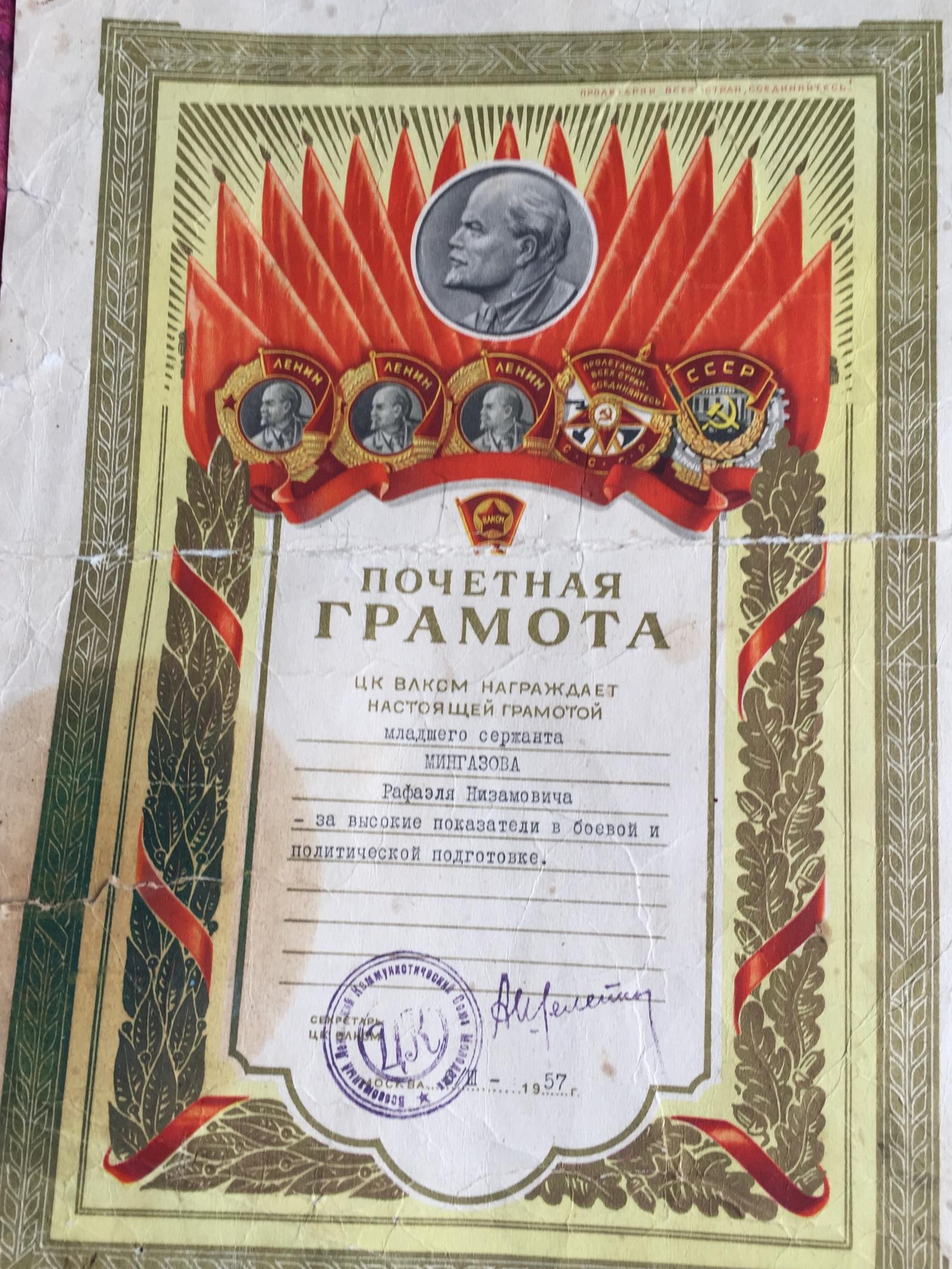 Ә 73884 нче номерлы хәрби частьнең 1957 елның 6 ноябрендә чыккан 143 нче Приказында “Өлкән сержант Минһаҗев Рафаэль Низами улы бик яхшы хәрби һәм сәяси әзерлек, социалистик ярышта югары күрсәткечләр, үрнәк тәртибе һәм хезмәт итүдә югары аңлылык күрсәткәне өчен Мактау китабына кертелгән”,-диелгән. Төрекмәнстан хәрби округы отличникларының Мактау китабына кертелгәнлек турында таныклык, ВЛКСМ ҮК Мактау грамотасы, сәяси идарә башлыгы генерал-майор В.Болдыревнең әти-әнисенә язган Рәхмәт хаты, “Отличный стрелок”, “Снайпер” билгеләре-гаиләбездә саклана торган кадерле ядкарьләр.