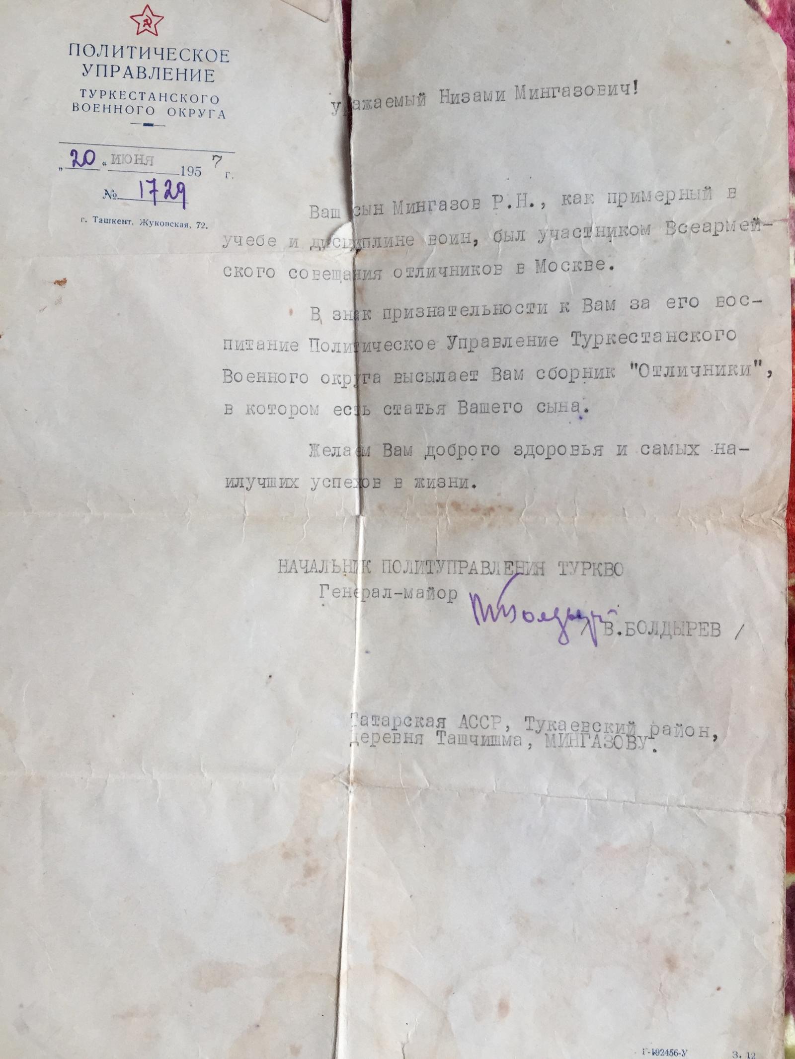 Отличникларның армия киңәшмәсе 1957 елның 16 мартында Мәскәүдә Г.К.Жуков инициативасы белән үткәрелә. Төрекмәнстан хәрби округыннан анда 3 кеше катнаша, шуларның берсе-татар егете Рафаэль була. Киңәшмә вакытында катнашучыларның мәкаләләреннән “Отличниклар” дигән җыентык бастырыла, тышына 26 авторның фотосы куела. “Өстә уң якта иң беренче-ул вакытта кече сержант, отделение командиры-Рафаэль Минһаҗев.