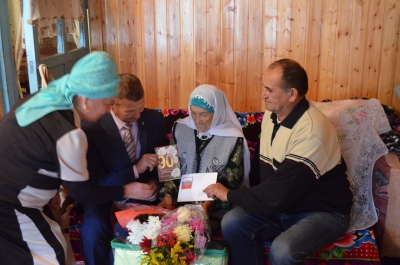 Юбилярны Россия Президенты, район башлыгы исеменнән котлау, бүләкләү тантанасында район башлыгы урынбасары Марат Нуриев, Кызылтау авылы җирлеге башлыгы Шәүкәт Гаффаров, җирле ветераннар Советы рәисе Мәрьям Хәерова катнашты.