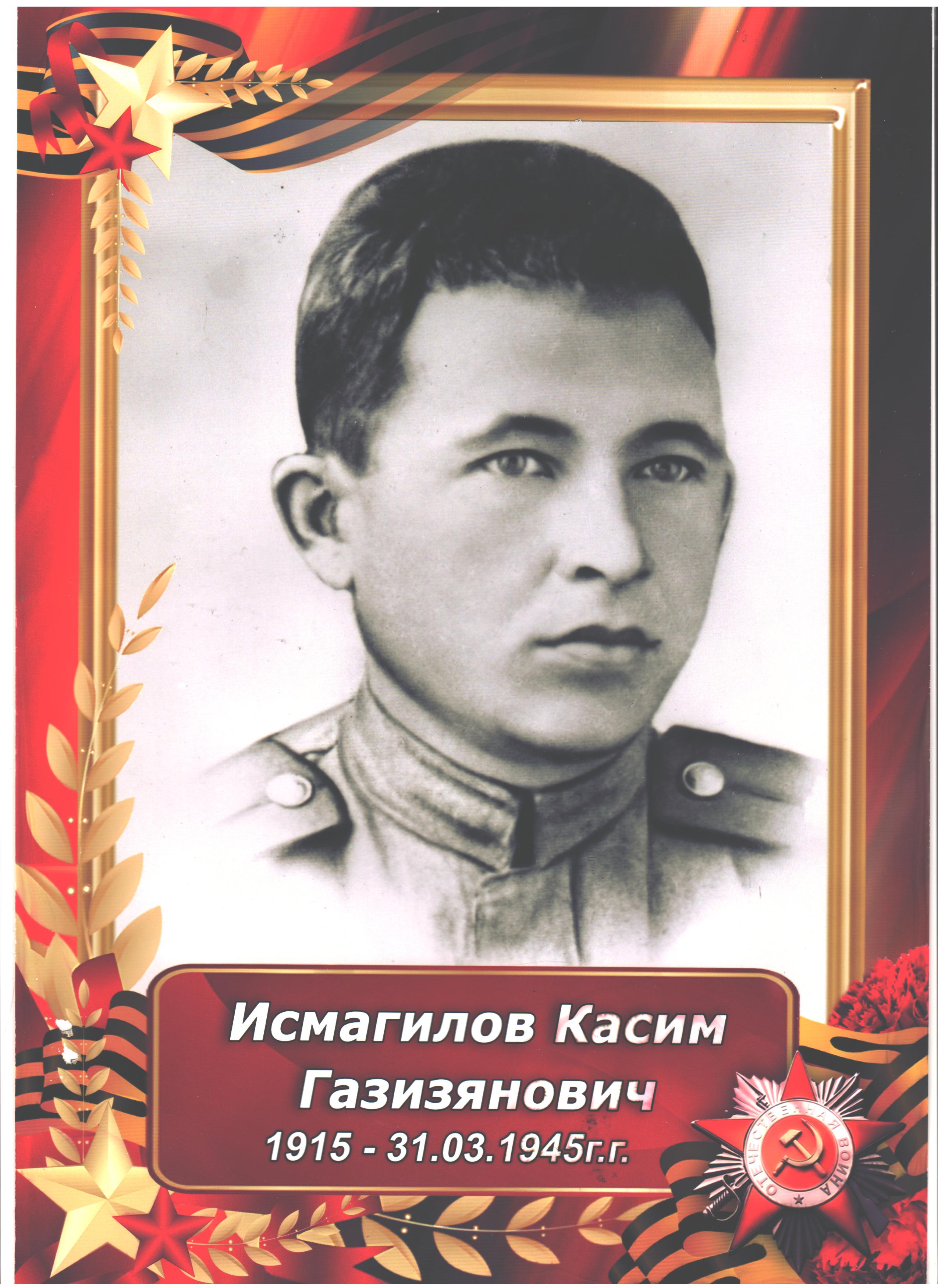 Исмәгыйлев Касыйм Газизжан улы 1945 елның 31 мартында хәрби хәрәкәтләр вакытында батырларча хәлак була. Олы улы Фоат абый 1986 елда Түбән Кама хәрби комиссариаты аша Мәскәү өлкәсе Подольск шәһәре Үзәк архивына сорау хаты җибәрә. Ул сораткан хатка җавапны тәрҗемәсез, рус телендә тәкъдим итәм. «Командир СУ – 76 лейтенант Исмагилов Касим Газизович 31.03.45г. сгорел (место захоронения не указано). Для сведения сообщаем, что 713 САП 31.03.45г. вел боевые действия в районе н.п. Прух на, что в 7 км. северо – западнее г. Бяла и в 3,5 км. северо – восточнее г. Цешин (Польша)».
