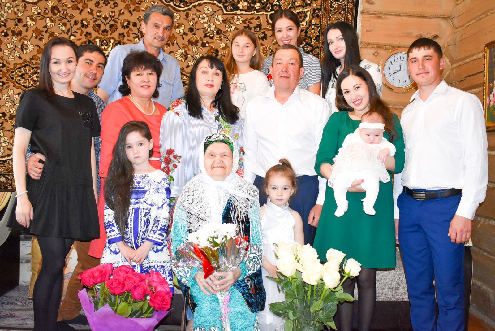 Фатыйма апаны котларга шулай ук биш оныгы һәм алты оныкчыгы кайткан иде. Алар барысы да аны ихлас күңелдән котладылар, чәчәк бәйләмнәре тапшырдылар. Бергә җыелып гаиләләре белән истәлекле фотога төштеләр.