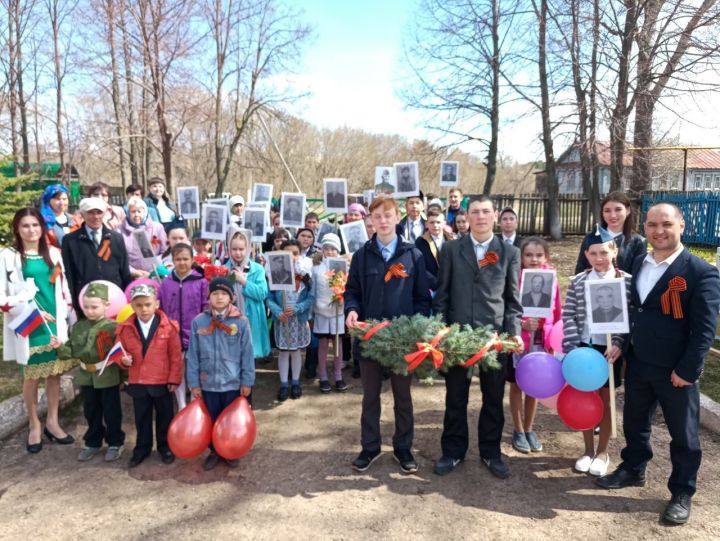 Укучылар шарлар, күгәрченнәр, флаглар һәм сугышта катнашкан әби-бабаларының фоторәсемнәрен тотып, бәйрәмчә киенеп, Бөек Ватан сугышында батырларча үлгән авылдашлар хөрмәтенә куелган обелискка бардылар. Бәйрәм сугыш чорына багышланган шигырьләр, тантаналы җырлар һәм дәртле биюләр белән үрелеп барды. Чал чәчле хезмәт һәм тыл ветераннары күз яшьләре аша үткәннәргә кайткандай булдылар. Соңыннан укучылар ветераннарга сәламәтлек һәм озын гомер теләделәр, ә алар үз чиратында балаларга онытылмаслык мизгелләр бүләк иткәннәре өчен рәхмәт әйтеп, аяз күк йөзе һәм тыныч тормыш теләделәр.
