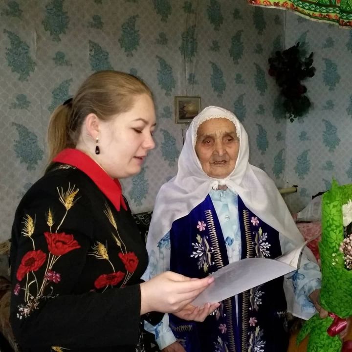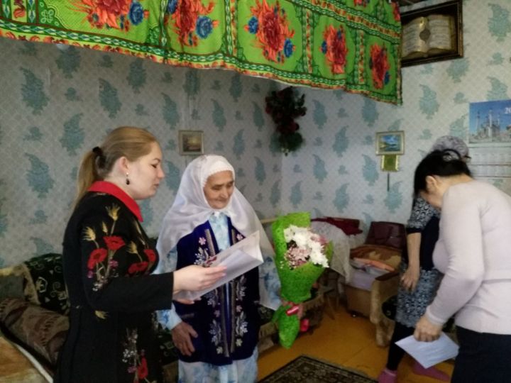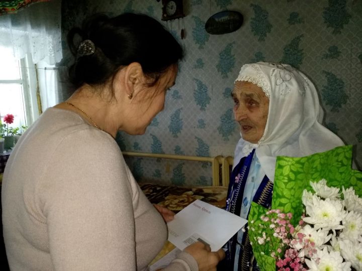 Әтнә районы советының аппарат җитәкчесе Гөлнара Галәүтдинова, социаль яклау оешмасы җитәкчесе Әминә Галиева, бөтен шартын китереп, әбекәйгә район башлыгы Габделәхәт Хәкимовның, Россия Президенты В. Путинның юбилей белән котлаган открыткаларын тапшырдылар. Истәлек бүләкләрен дә әбекәй рәхмәт итеп алды.