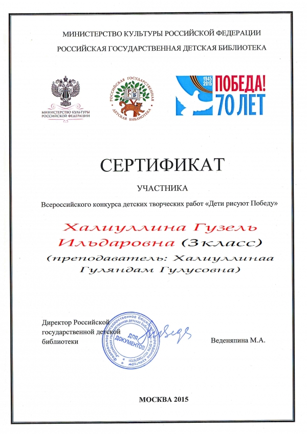 Җиңүнең 70 еллыгы уңаеннан россиякүләм "Балалар Җиңүне төшерә" ("Дети рисуют Победу") рәсем конкурсында уңышлы катнашып, 4 укучы сертификатлар, ә аларны әзерләгән укучылар Рәхмәт хатлары белән бүләкләнделәр: 3 класстан Хәлиуллина Гүзәл, 8 класстан Мифтахова Рүзилә (укытучылары Хәлиуллина Гөләндәм Гөлүс кызы), 2 класстан Нәбиуллина Гүзәл (укытучысы Нәбиуллина Гөлфирә Минемөхәммәт кызы), Хәлиуллина Алия (укытучысы Әһелтдинова Наилә Вил кызы).