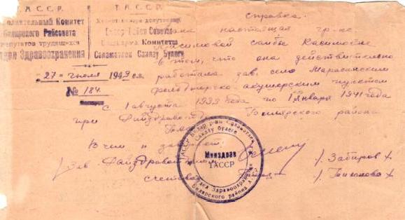 Мин 1941 елның август аенда Чирмешән районы ( Әлмәт районы) Елховой авылына фелдшер-акушерлык пункытына мөдир булып эшкә килдем һәм 45 ел инде эшемне дәвам итәм.Ул чагында аерым медпункт йорты юк иде. Мин үземнең аз-маз даруларым,вак-төяк инструментларым белән сумкамны күтәреп,авылның төрле почмакларындагы буш йортларда эшләп йөрдем.