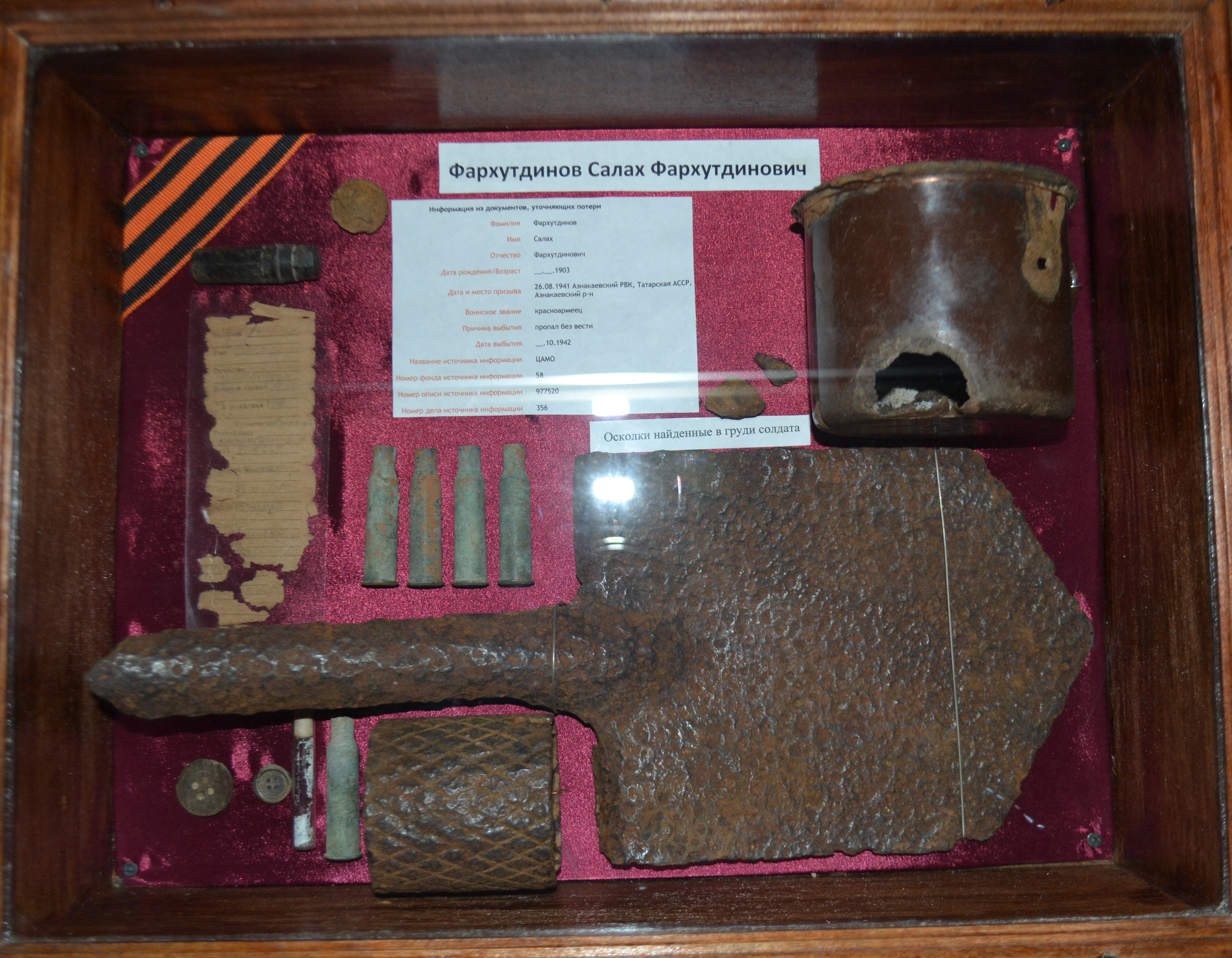 Хәрбинең гәүдәсе янында каска, гильза, кружка, сапер көрәге, шинель сәдәфе, суның составын куркынычсызландыру пробиркасы, башка калдыклар табыла.