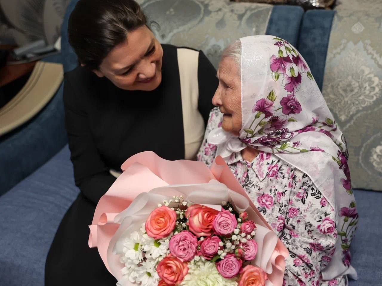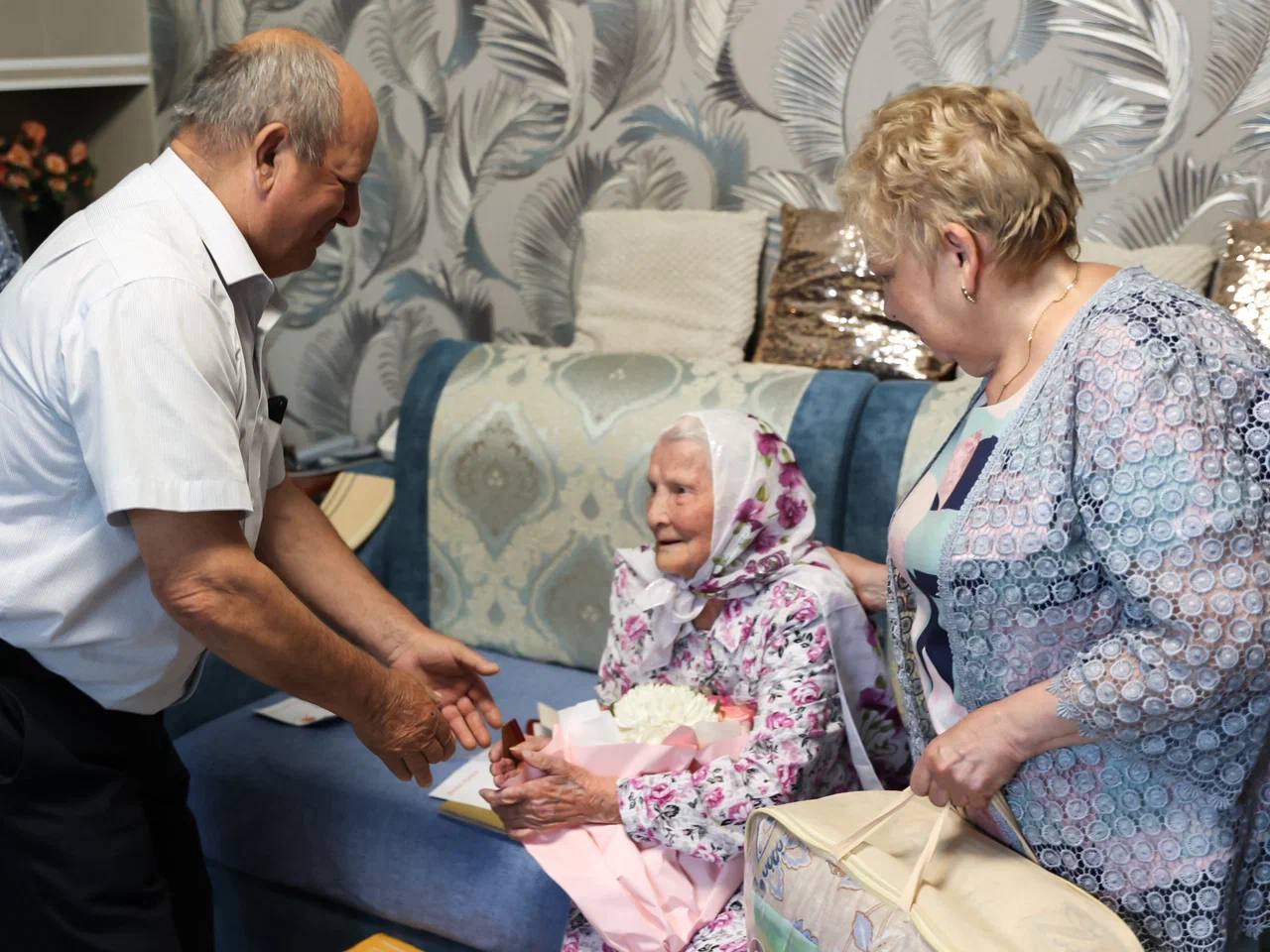 Тыл хезмәтчәне, Әлмәттә яшәүче Габдрахманова Хәмидә Нәбиулла кызы юбилеен билгеләп үтә. Юбилярны котларга Әлмәт районы башкарма комитеты җитәкчесе Гүзәл Хәбетдинова килде.