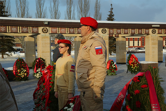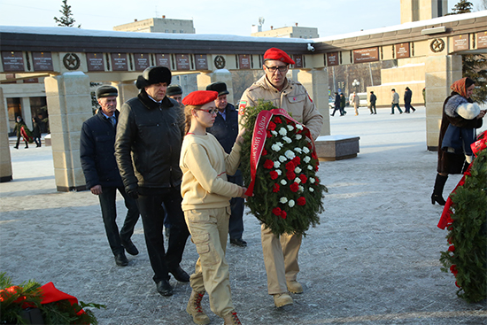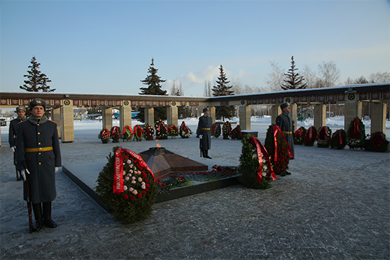 Делегатлар иң элек Ватанны саклаучылар хөрмәтенә Мәңгелек ут каршына чәчәкләрдән ясалган венок куйдылар.