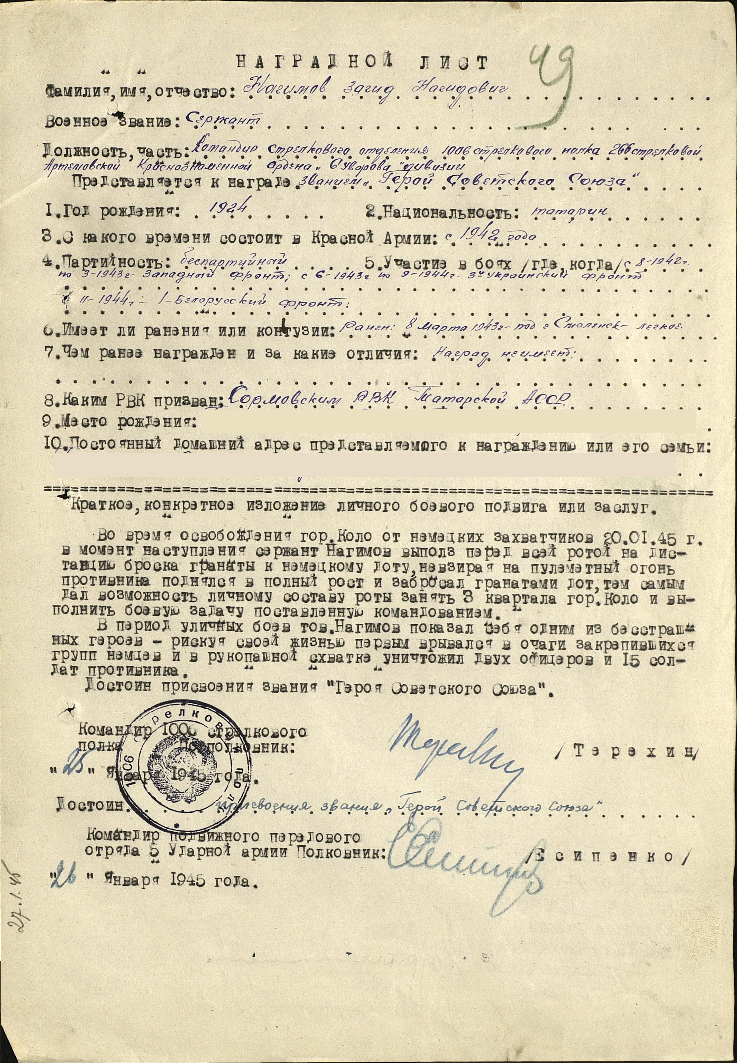 Нәгыймов Заһид 1924 елда Юлтимер авылында туган. Сугыш башланганда ФЗӨ мәктәбендә укыган була. Фронтка китәргә бик омтылса да, 17 яшьтә генә булганга күрә, аны алуны кичектереп торалар. Егет илне сакларгатуган авылыннан, бер ел колхозда эшләгәннән соң китә. 1942 елның августыннан Кызыл Армия сафларында. Сарман егете сугышчан юлын Көнбатыш фронтта башлый. Смоленск тирәсендә яралана, аннары контузия ала. Мәскәү янындагы җиңүләрдән соң дошманны куа-куа Польша җиренә барып җитә. 1006 нчы укчы полк составында сержант Нәгыймов 1945 елның 26 январендә фашистлар Германиясе җиренә аяк баса. Бөтен ротага һөҗүмгә күтәрелергә комачаулаган дошман ДОТын граната белән шартлатып юк итә, нәтиҗәдә рота үз алдында куелган максатны үтәп, шәһәрнең 3 кварталын фашистлардан чистарта; шәһәр урамнарында барган бәрелешләр вакытында 2 офицер, 15 солдатны Заһид үз куллары белән юк итә. Шушы батырлыгы өчен 1006 нчы укчы полк командиры подполковник Терехин 25 гыйнвар көнне аңа Советлар Союзы Герое исеме бирү турында “Бүләкләү кәгазе” тутыра. 26 нчы гыйнварда полковник Есипенко да бу тәкъдимне раслап, үз имзасы белән “Советлар Союзы Герое исеменә лаек” дип язып куя. Тик... Заһитка бу геройлыгы өчен 5 Удар Армия буенча 1945 нче ел 31 гыйнвар Приказы белән, Сугышчан Кызыл Байрак ордены тапшырыла.