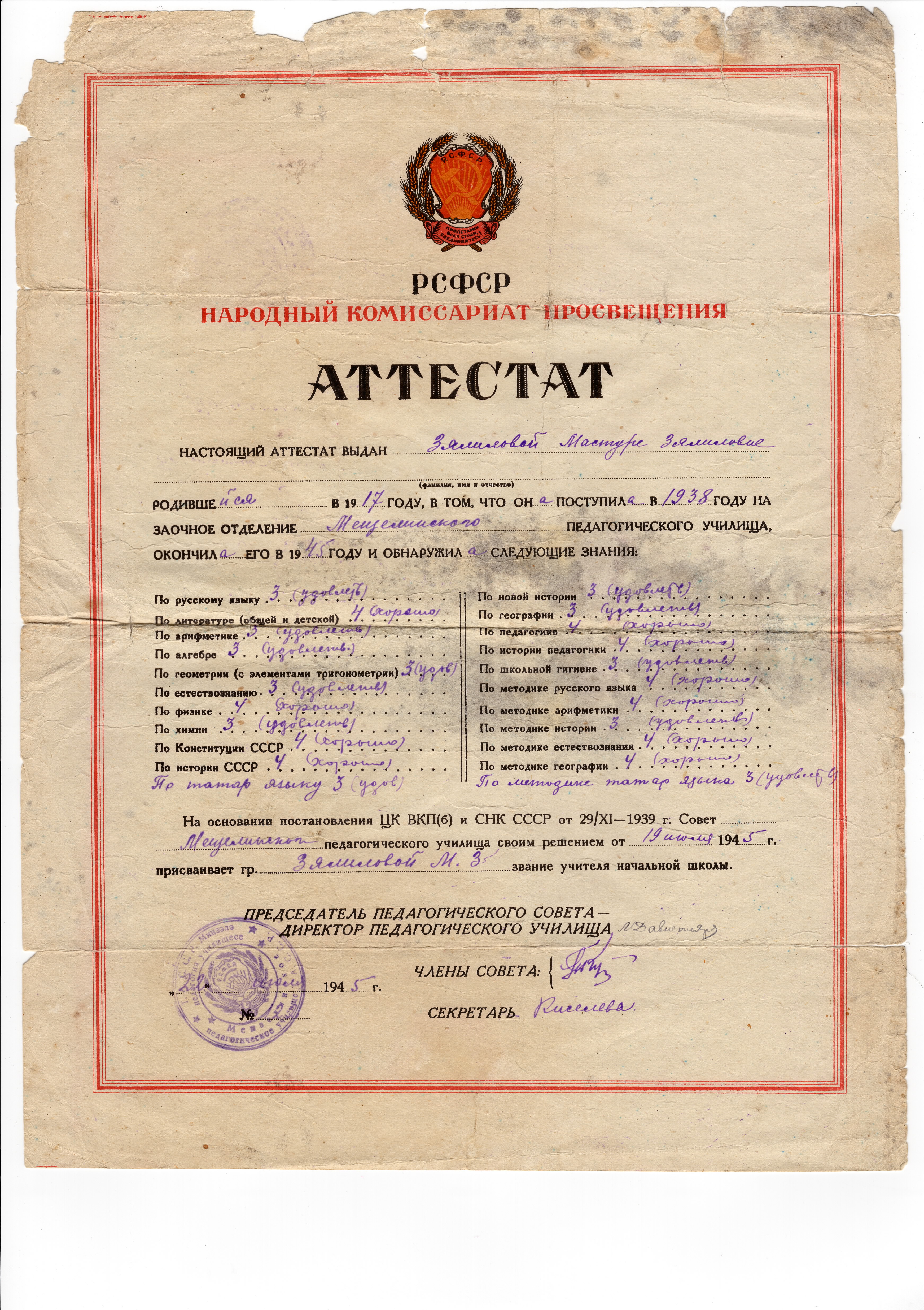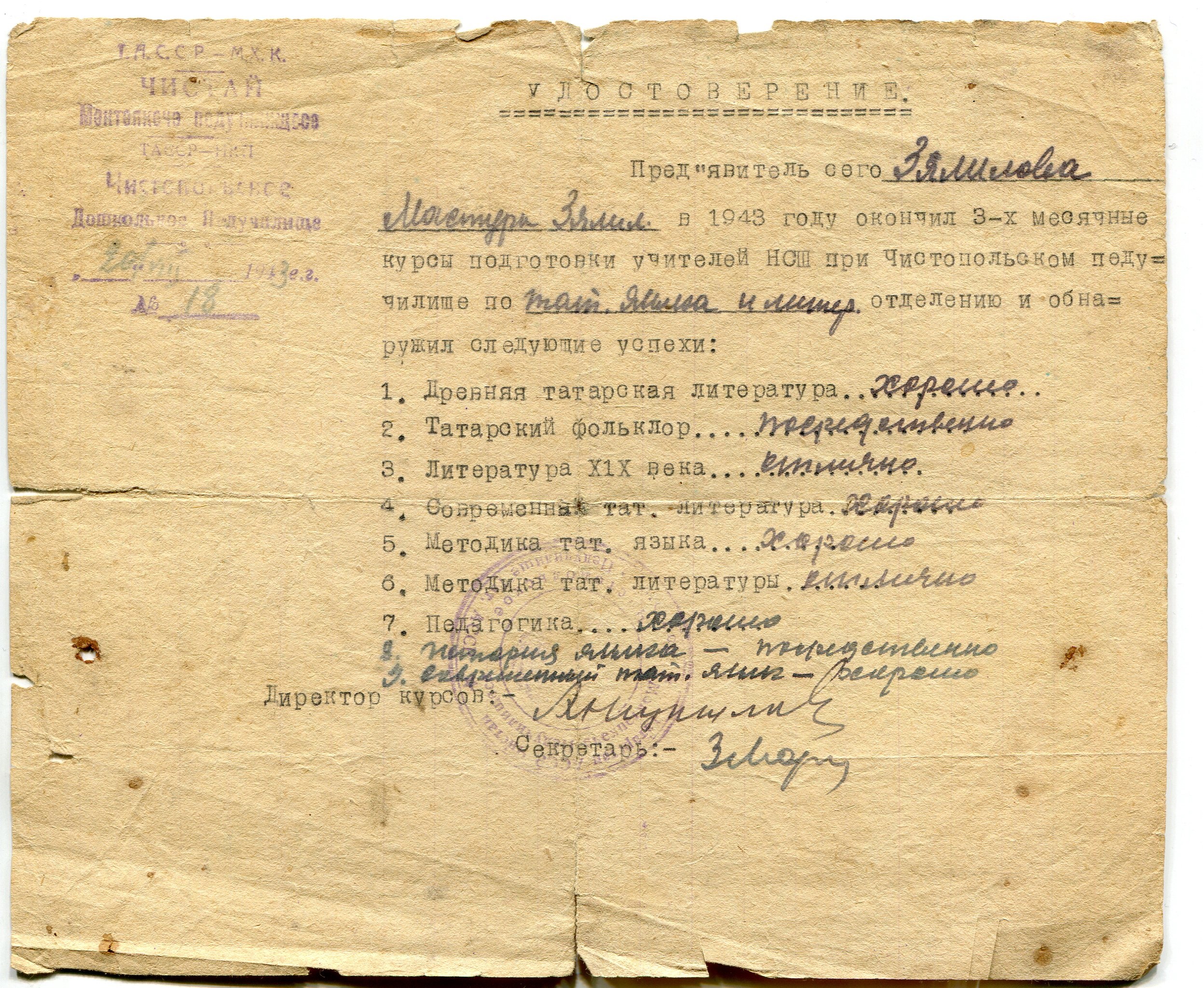 Дүрт телне: татар, гарәп, латин һәм рус телләрен яхшы дәрәҗәдә үзләштергән белгеч буларак, кече яшьтәге мәктәп балаларын, зур яшьтәге укучыларны, өлкәннәрне белемле, мәгърифәтле итү өстендә бик күп көч куя. Бөек Ватан сугышы елларында фронтка киткән ир-атлар, егетләр урынына басып, мәктәпләрдә, колхоз басу-кырларында яз-көз, җәй-кыш хезмәт куя. Шулай ук урман кисү, фронт өчен агач бүрәнәләр һәм утын әзерләү, санап бетермәслек күп төрле эшләр башкарырга туры килә, шул исәптән оештыру эшләре дә. Барсы да фронт өчен, җиңү өчен.