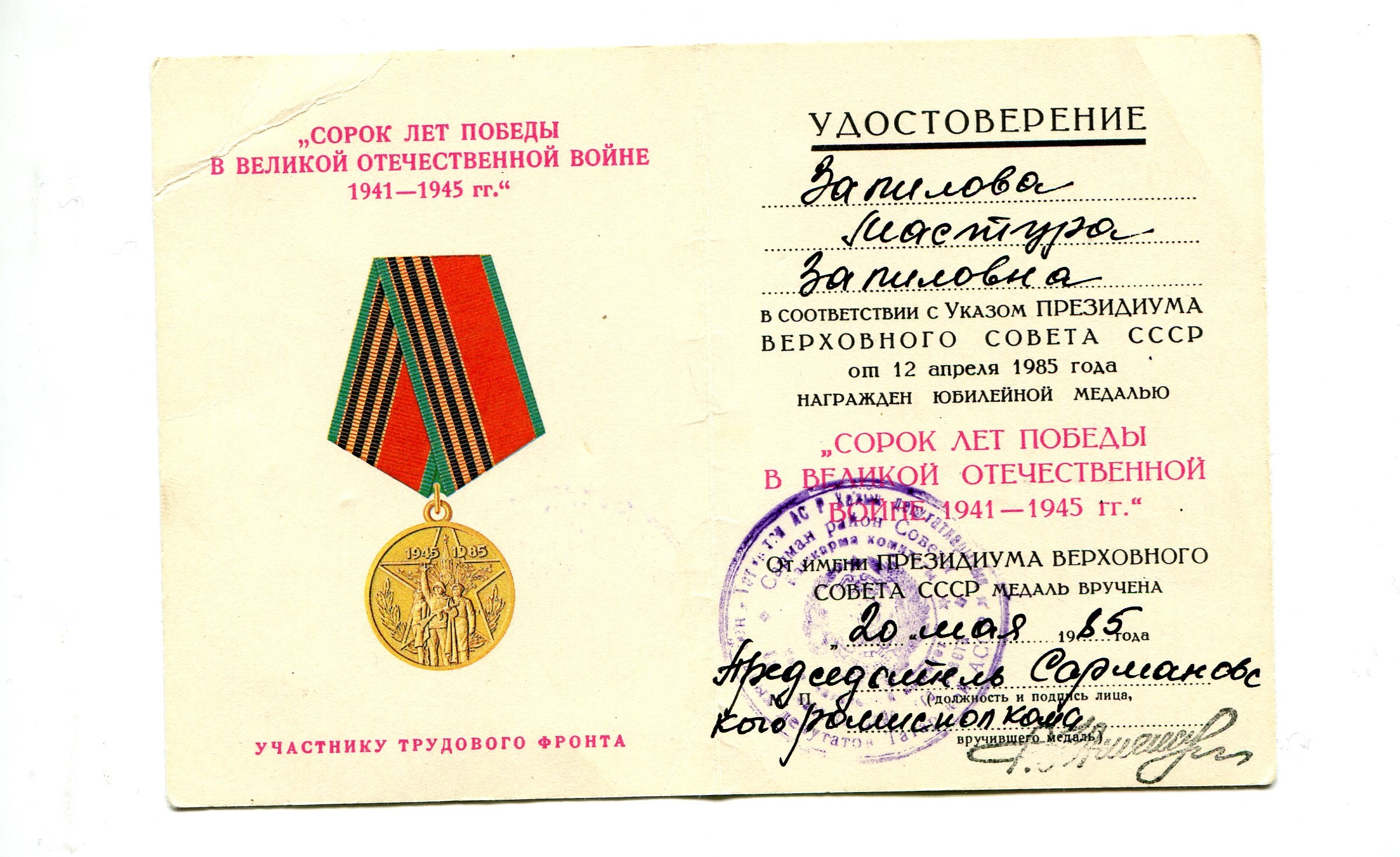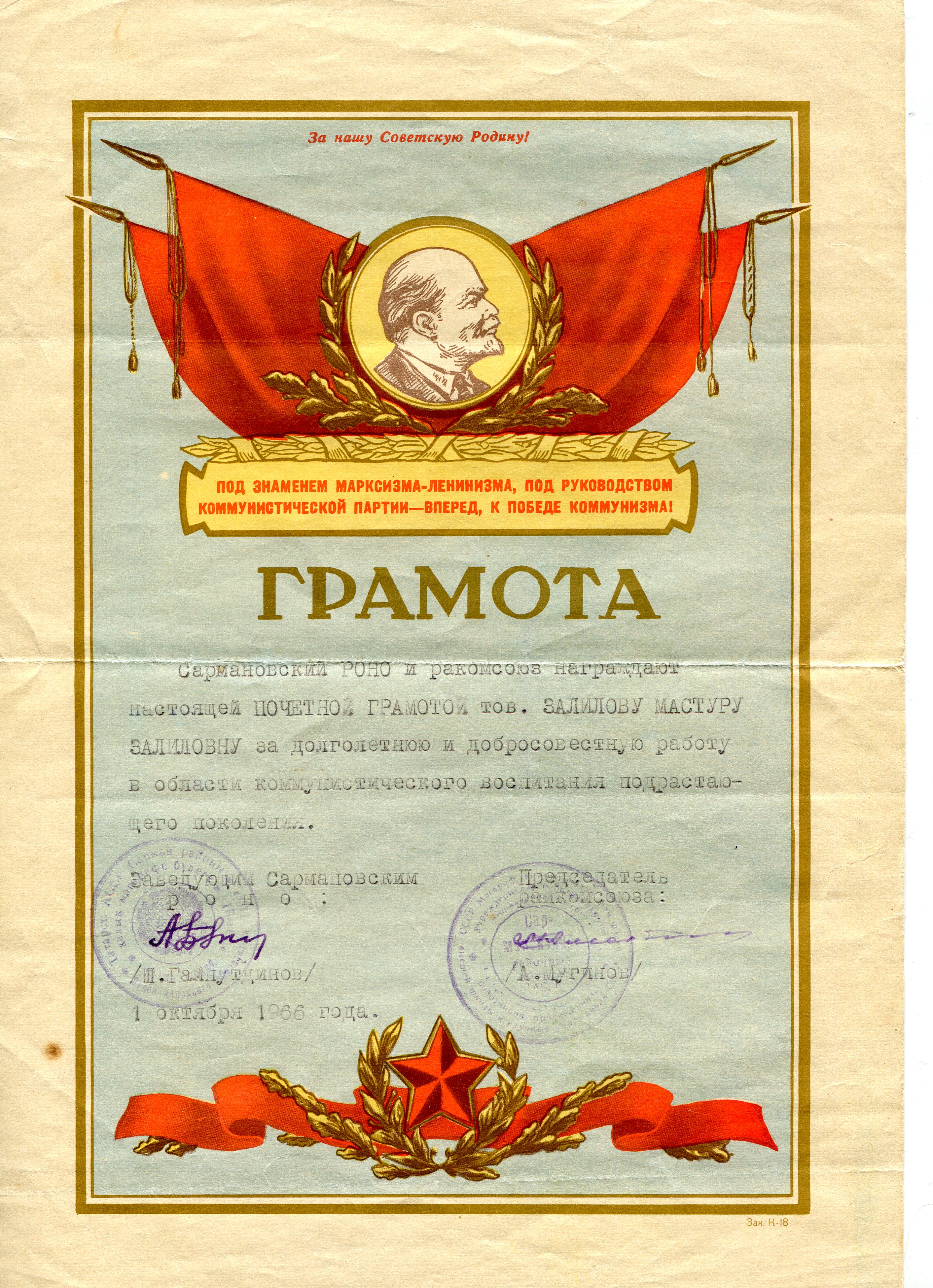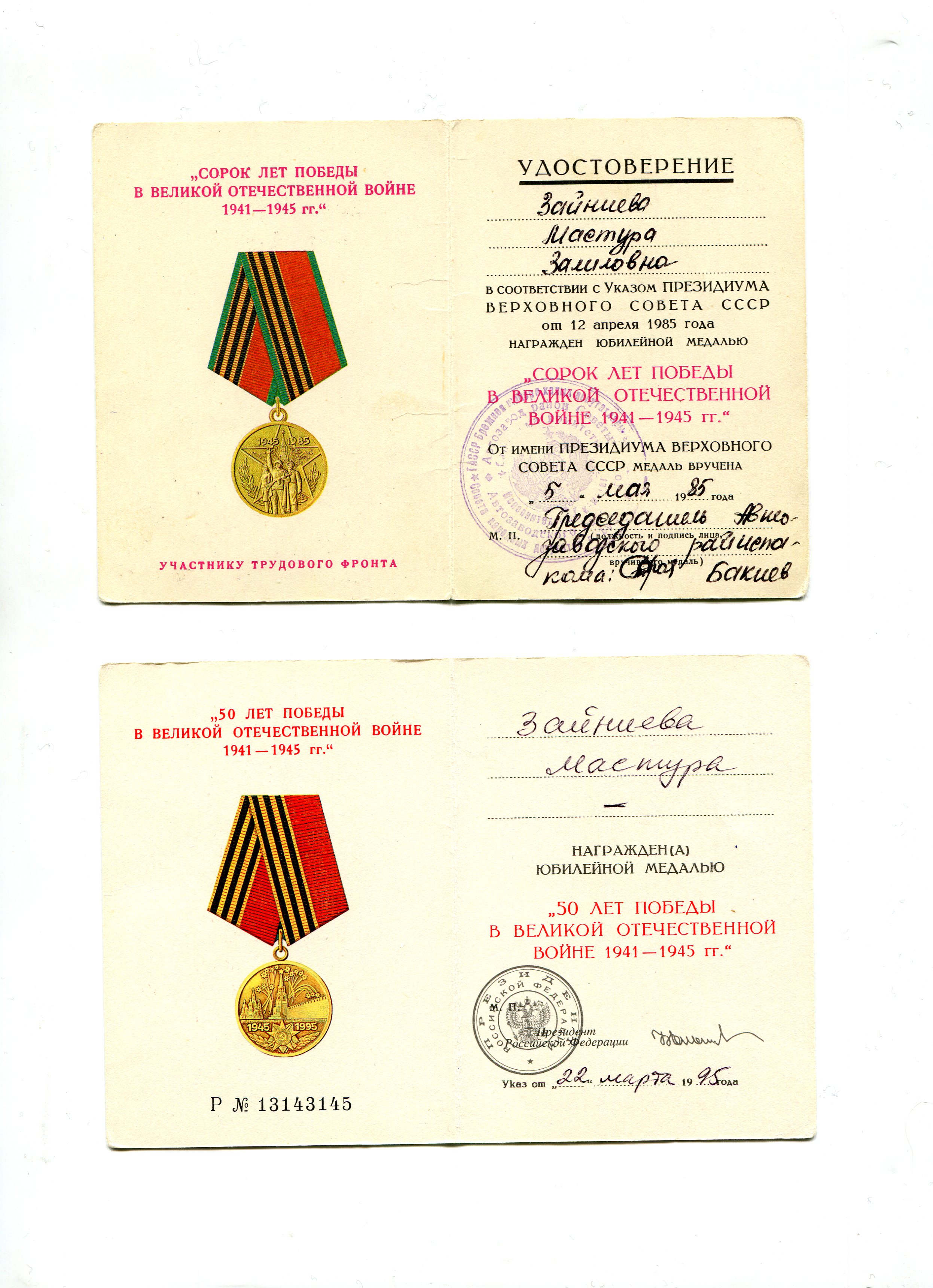 Зәйниева (Җәлилова) Мәстүрә Җәлил кызы СССР Югары Советы Президиумы указы нигезендә 1945 елның 6 июнендә “За доблестный труд в Великой Отечественной войне 1941-1945 гг.” медале белән бүләкләнә. Медальның сериясе, номеры: Э№082108. Бөек җиңүнең 40, 50, 55, 60 еллык юбилей медальләре һәм Сарман районының “Почетная грамота”сы белән бүләкләнгән. Хезмәт юлының беренче көненнән башлап Сарман районы мәгариф бүлеге системасында эшләп, Сарман районы халкына һәм илебезгә игелекле хезмәт кылып 1972 елда лаеклы ялга (пенсиягә) чыкты. 2005 елны 18 сентябрендә вафат булды һәм Яр Чаллы шәһәрендә җирләнде. Материалны гаилә архивындагы оригинал документлар нигезендә улы Рафаэль Зәйниев Г. әзерләде.