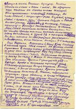 Елена Алексеевна! В своём первом письме, под большим впечатлением его и воспоминаниям школьного учительского и детского коллектива нашей школы, я написал тебе о юных патриотах, как (оторвана бумага) детях. Когда это письмо отпустил в почтовый ящик, тогда только пришла в голову мысль, что о своей-то работе там ничего не сказал. Этим письмом хочу вкратце дополнить этот пробел. 3-х месячное моё участие в боях со своими героическими полками очень многогранно и обширно. В самые тяжелые дни нашей страны, в дни, когда немецкие оккупанты могли дальнобойными пушками бить в сердце нашего Советского Союза - Москву, нас собрал в одном из городов маршал и старый большевик тов. Ворошилов и сказал: «Вы члены партии, вы должны быть отцами духовными бойцов своих, сплачивайте их и поднимите у каждого из них сознание ответственности и опасности над нашей страной. От вас зависит – будете ли вы свободными гражданами СССР или рабами немецких фашистов». Мы все, как один, дали К.Е.Ворошилову большевистское обещание – остановить немца, отстоять Москву и под Москвой положить начало разгрома немецких оккупантов. Дело прошлое, но на уроках мы всегда учимся. (…) время среди наших людей были малодушные трусы и боязнь, боязнь молодчиков гр…. . Нужно было поднимать людей, вливать в их душу веру в себя, бесстрашие и презрение к смерти. Днем, ночью, группами и в одиночку нужно было ещё в эшелонах поднимать сознание бойцов, убеждать и передавать им свои знания и уверенность в победе. Устные беседы, советы, ответы на вопросы, читки и рассказы из прошлого, встречи с фронтовиками – всё нужно было пускать в ход, чтобы выполнить обещание, данное тов. Ворошилову. Я понимал и знал, что от успеха первого же боя, от первого боевого крещения полка будет зависеть и дальнейшая боевая работа всей части.