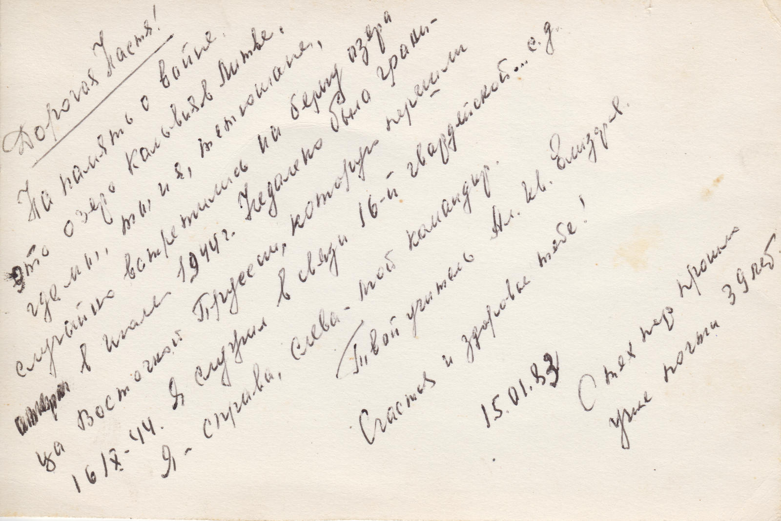 В 1983 г. была организована встреча фронтовиков, на которую приехал и Елизаров А.И. Состоялась теплая встреча учителя и ученицы. Здесь он подарил Анастасии Ильиничне фотографию, сделанную почти 39 лет назад на берегу далекого озера в Литве.