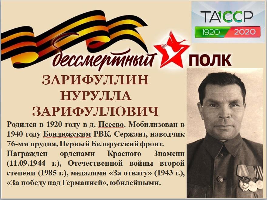 Всем им пришлось в грозные годы войны встать на защиту Родины. Один из них Зарифуллин Нурулла Зарифуллович, уроженец д. Псеево Бондюжского района РТ. Мобилизован в 1940 году Бондюжским районным военкоматом ТАССР. Сержант, 76 пограничный отряд; 40 стрелковый Амурский полк, 102 стрелковая дивизия; правильный, наводчик 76-мм орудия, Первый Белорусский фронт. Награжден орденами Красного Знамени (11.09.1944 г.), Отечественной войны второй степени (1985 г.), медалями «За отвагу» (1943 г.), «За победу над Германией», юбилейными.