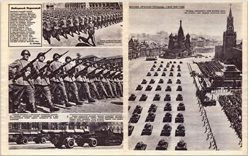 «Неповторимо прекрасно первомайское утро в Москве. Во всем праздничном облике столицы — в нарядно украшенных улицах, в веселом оживлении москвичей, во всеобщей радостной приподнятости чувствуется, как глубоко и ясно понимает и ощущает народ близость нашей окончательной победы. Это народное чувство лучше всего выразить словами первомайского приказа товарища Сталина: «В этом году народы нашей Родины встречают день Первого мая в обстановке победоносного завершения Великой Отечественной войны».