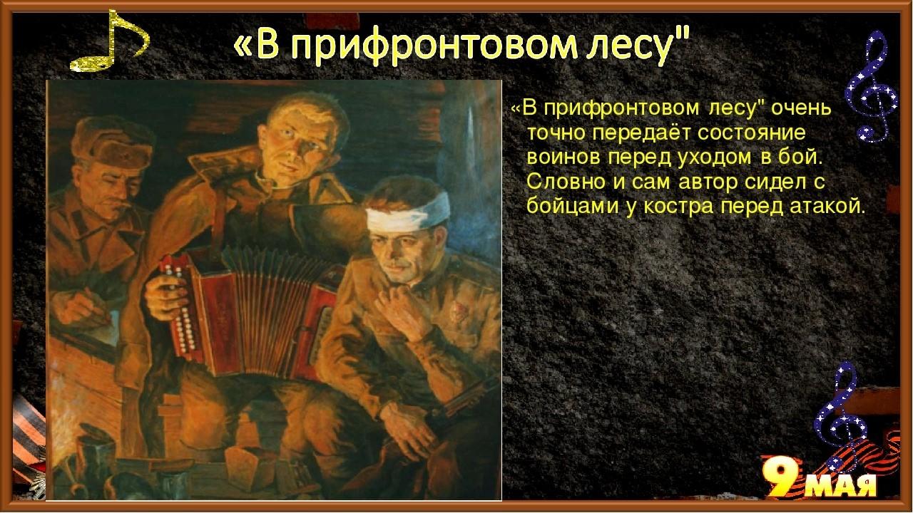 «Стихотворение «В лесу прифронтовом» Исаковский прислал мне в 1942 году из эвакуации, в разгар Сталинградской битвы. Помню, прочитав его несколько раз, я подумал: только поэт, ежеминутно и глубоко переживающий все, что переживает народ, может так ощутить сердцем и разумом, увидеть сквозь сотни километров и прифронтовой лес, и невесомый березовый лист, и бойцов, слушающих в короткие минуты затишья гармониста. Первым и, надо сказать, великолепным исполнителем вальса «В прифронтовом лесу» был певец Ефрем Флакс. Потом появились другие исполнители, мне довелось слушать их не только с эстрады и по радио, но и в прифронтовых лесах, лежавших по пути армий Первого Белорусского фронта...» - так вспоминал Матвей БЛАНТЕР.