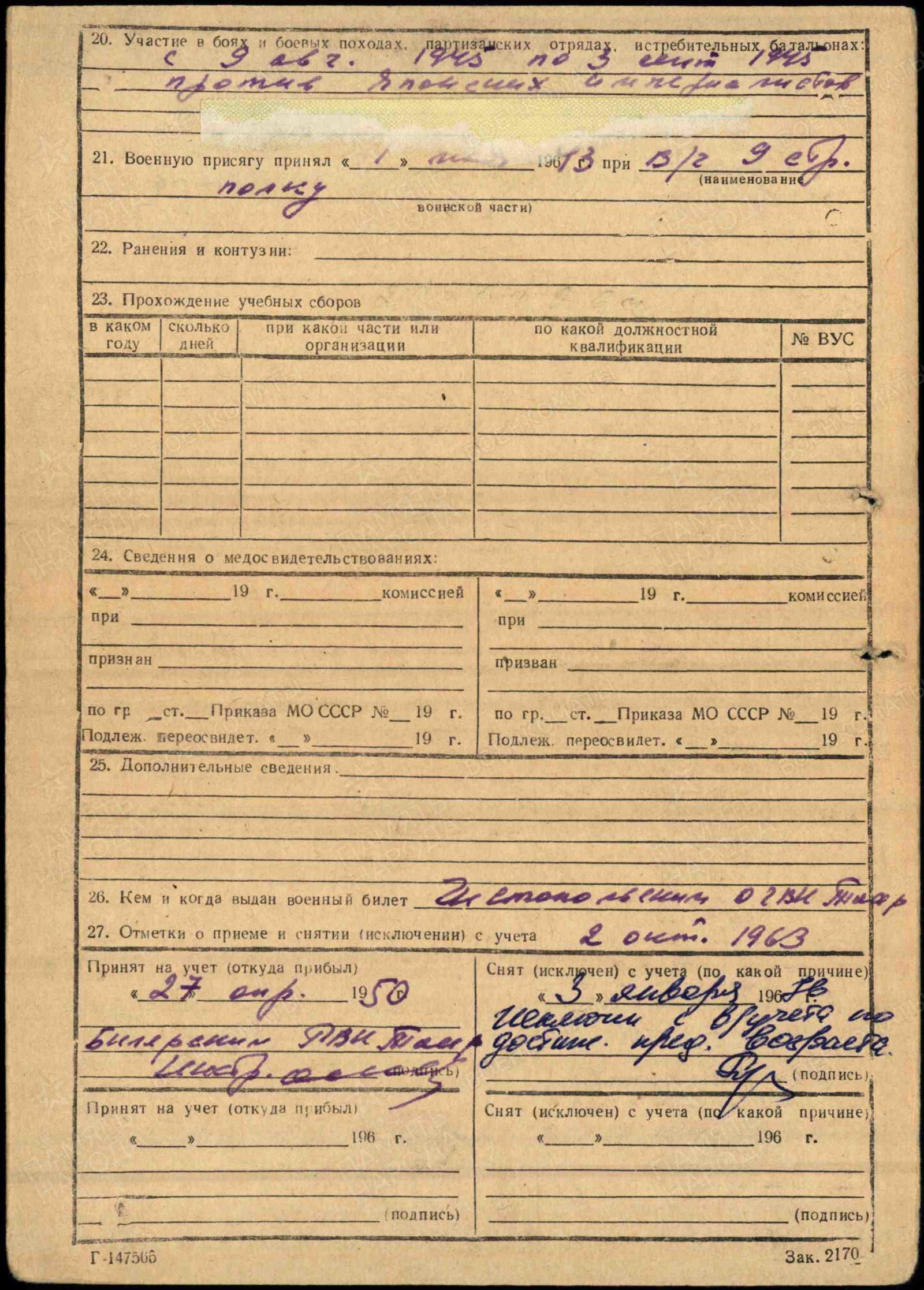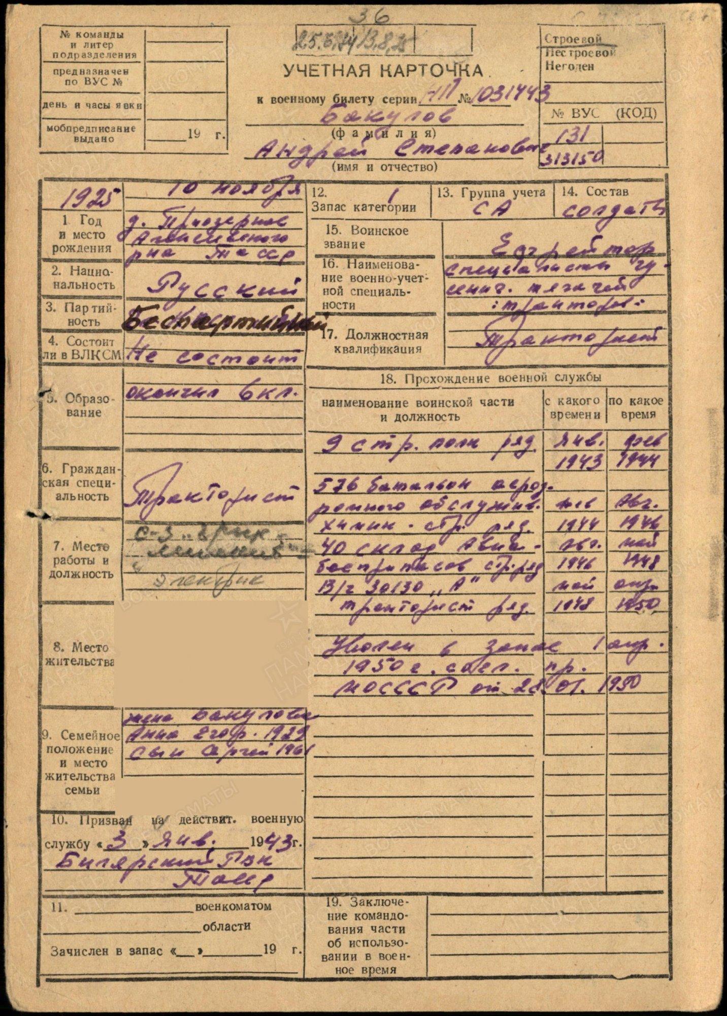 БАКУЛОВ Андрей Степанович, 1925, с. Абалдуевка. Мобилизован 3 янв. 1943 Билярским РВК. Ефрейтор, хим. инструктор 576 БАО (батальон аэродромного обслуживания) Дальневосточного фронта. Участвовал в Советско-японской войне. Награждён медалью «За победу над Японией». Демобилизован в 1950.