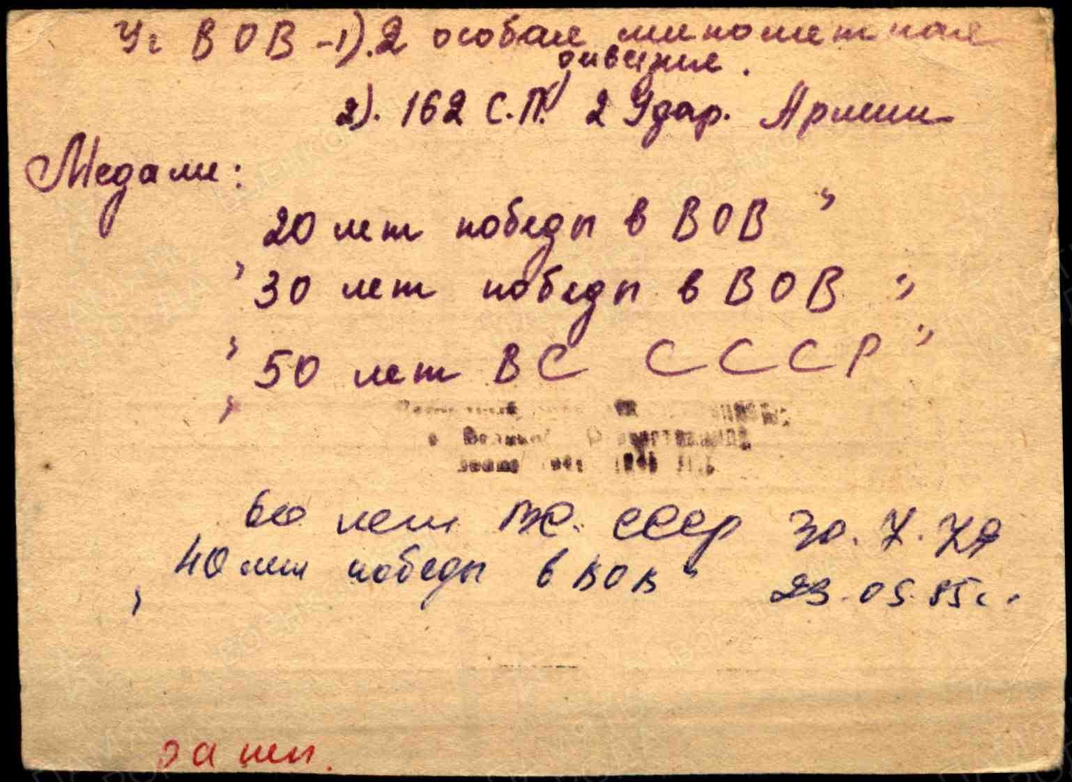 Призван: 08.1941г. В Великой Отечественной войне участвовал: с 08.1941 по 02.1942 г в 152 особой минометной дивизии; был ранен с 02.1942 по 05.1942г. находился на излечении в ЭГ; с 05.1942г по 07.1942г. 162 стрелковый полк 2 Ударная Армия. Воинское звание: рядовой.
