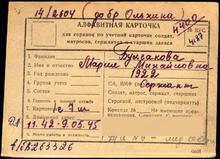 Призвана 18.05.1942г. Ново-Письмянским РВК, ТАССР. Воинское звание мл. сержант; красноармеец. Воинская часть 12 полк связи 12 воздушной армии.