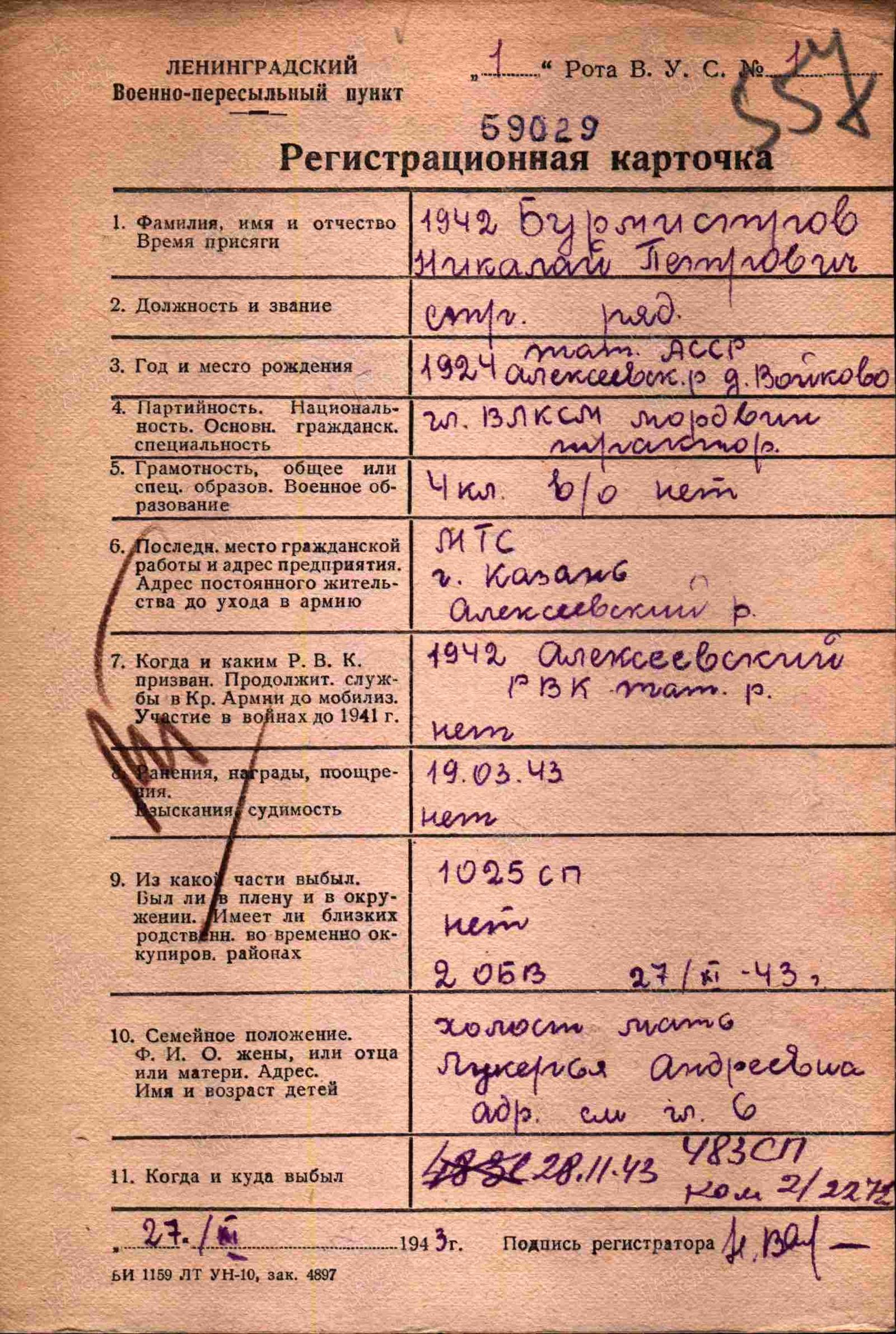БУРМИСТРОВ Николай Петрович, 1924, д. Войкино. Мобилизован в авг. 1942 Алексеевским РВК. Член ВЛКСМ. Красноармеец, 1025 СП 291 СД 23 А Ленинградского фронта. Ранен 19 марта 1943. Находился на излечении в ЭГ 263, ЭГ 2015, г. Ленинград. В нояб. 1943 зачислен в состав 482 СП 131 СД 2 УдА ЛенФ. Убит 15 янв. 1944, с. Лапинское, Ораниенбаумский р-н, Лен. обл. Увековечен: д. Гостилицы, Ломоносовский р-н, Ленингр. обл.
