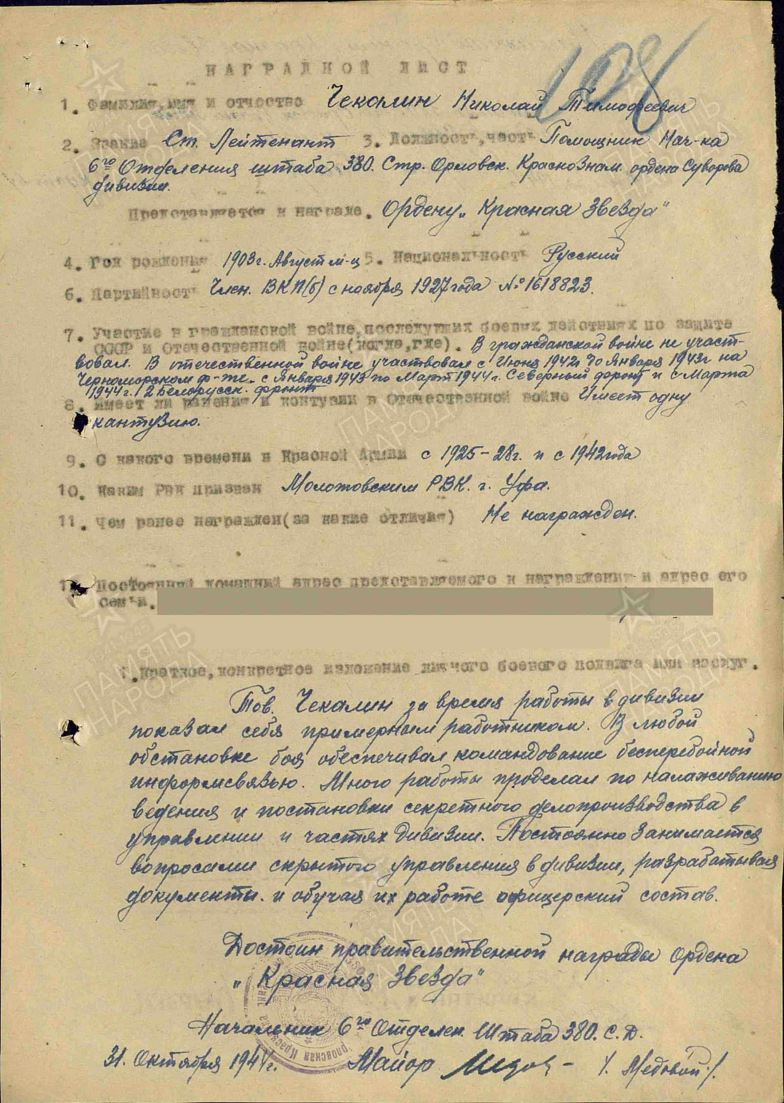 ЧЕКАЛИН Николай Тимофеевич, 1903, д. Александровка. В 1925-1928 проходил срочную службу в РККА. Член ВКП(б) с 1927. Мобилизован в 1942 Молотовским РВК г. Уфа. Политрук, Черноморский флот. Перенёс контузию. С 1943 воевал на Северо-Западном, Брянском, Белорусском, 1 и 2 Белорусском фронте в составе 53 А/ 65 А/ 3 А/ 50 А/ 49 А. Участник битвы на Курской дуге, освобождения Белоруссии, Польши, боёв в Германии. Ст. лейтенант, пом. нач. 6 Отделения (секретного делопроизводства, шифрования и кодирования связи) штаба 380 СД. Награждён орденами Красной Звезды (1944), Отечественной войны 2 ст. (1945). Уволен в запас 6 нояб. 1945.