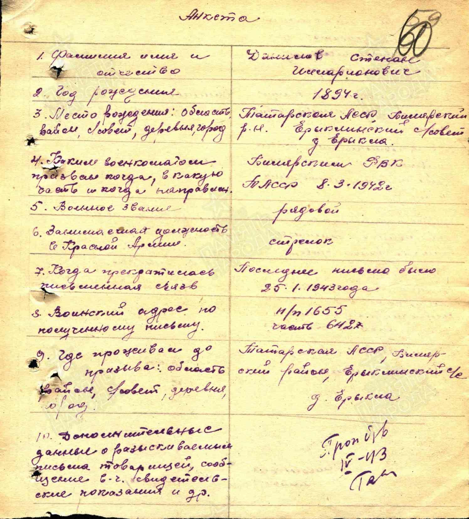 ДАНИЛОВ Степан Илларионович, 1894, д. Ерыкла. До призыва в армию работал в к-зе «Заветы Ильича». Мобилизован Билярским РВК 8 марта 1942 как нестроевой военнообязанный. Направлен в стройтрест № 14 НК авиапромышленности. 18 апр. 1942 повторно мобилизован Молотовским РВК г. Казань. Красноармеец, 42 СД 49 А Западного фронта. Последнее письмо датировано 25 янв. 1943. Учтён пропавшим без вести.