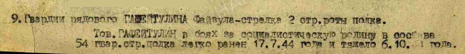 ГАФИАТУЛЛИН Файзулла Калимуллович, 1926, с. Нижние Тиганы. Мобилизован Алексеевским РВК 5 нояб. 1943. Гв. красноармеец, 54 гв. СП 19 гв. СД 5 гв. СК 39 А 1 ПрибФ и 3 БелФ. Легко ранен 17 июля 1944, тяжело ранен 6 окт. 1944. Находился на излечении в ЭГ 5826, п. Кулебаки, Горьковская обл. Демобилизован по ранению 14 фев. 1945. Награждён медалью «За отвагу», орденом Отечественной войны 1 ст. (1985). Скончался в 2002.