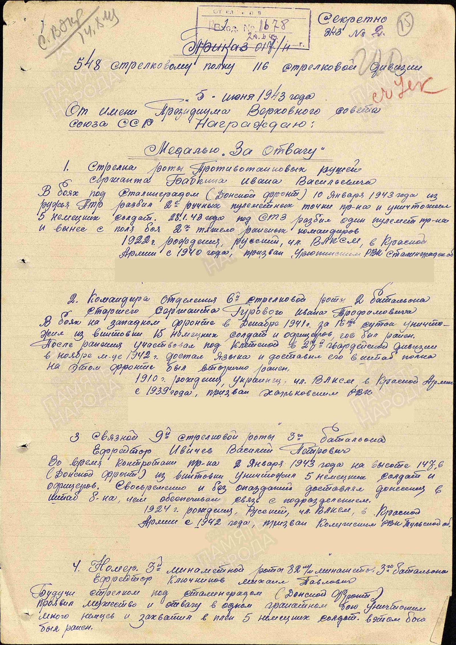 КЛЮЧНИКОВ Михаил Павлович, 1923, д. Бутлеровка. Мобилизован 8 марта 1942 Алексеевским РВК. Член ВЛКСМ/ ВКП(б) с 1944. Ефрейтор/ сержант, стрелок/ заряжающий/ наводчик 82 мм миномёта/ ком. телефонного отделения роты связи 548 СП 116 СД 1 гв. А Сталинградского фронта, 24 А/ 66 А Донского фронта, 53 А Степного/ 2 УкрФ, 5 гв. А/ 52 А 2 и 1 Украинского фронта. Перенёс два лёгких ранения в 1942 и 1943. Демобилизован 12 марта 1947 в звании «гв. сержант». Работал в к-зе «Родина». Награждён двумя медалями «За отвагу», медалью «За оборону Сталинграда», орденами Отечественной войны 2 ст. (1945) и 1 ст. (1985).
