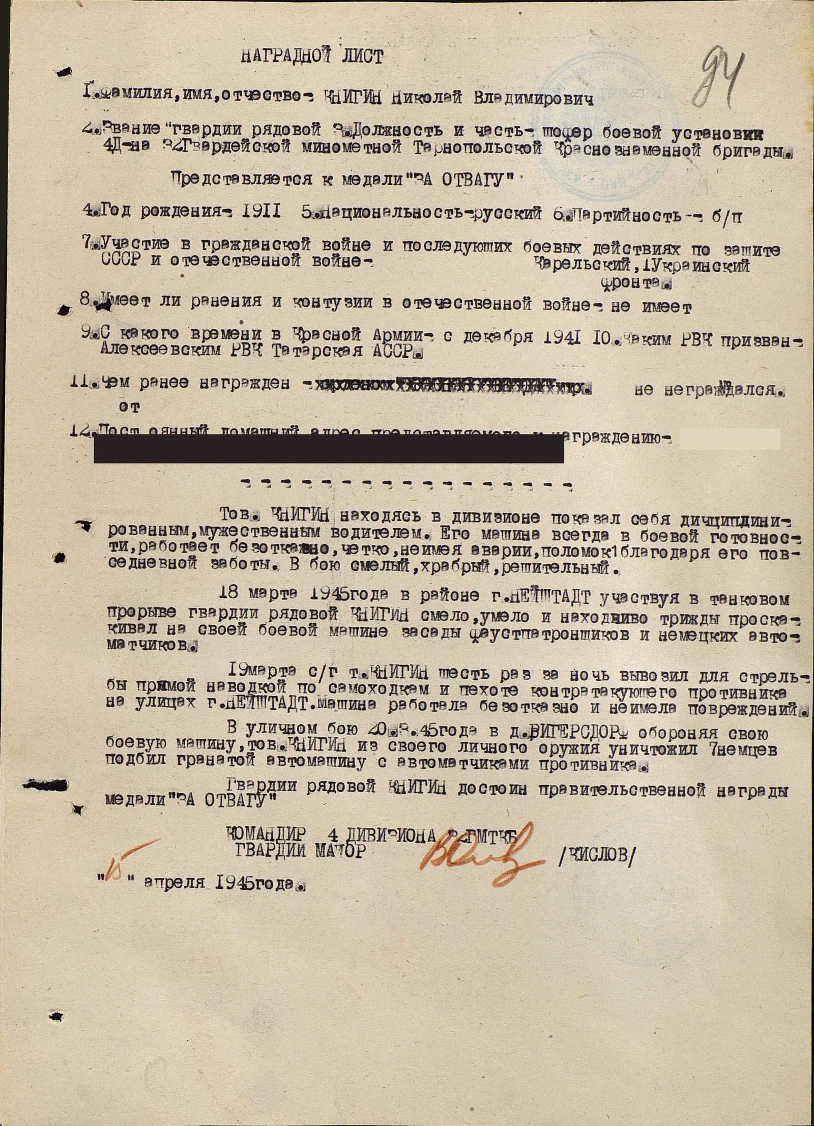 КНИГИН Николай Владимирович, 1911, с. Большой Красный Яр. Мобилизован Алексеевским РВК 4 дек. 1941. Воевал на Карельском фронте с апр. 1942, с дек. 1943 - на 1 Украинском фронте в составе 7 АртК прорыва РГК/ 60 А/ 21 А/ 5 гв. А/ 6 А. Гв. красноармеец, шофёр транспортной и боевой машины 32 гв. МинБр реактивной артиллерии 3 гв. МинД. Участник освобождения Украины, Польши, штурма Берлина. Награждён медалями "За отвагу", "За взятие Берлина", орденом Красной Звезды. Демобилизован в 1945. Умер в 1959.