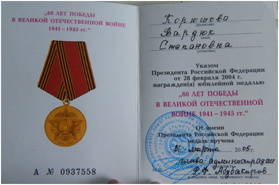 • Удостоверение к медали А № 0937558 «60 лет победы в великой отечественной войне 1941-1945г.» выдан 31 марта 2005 г.