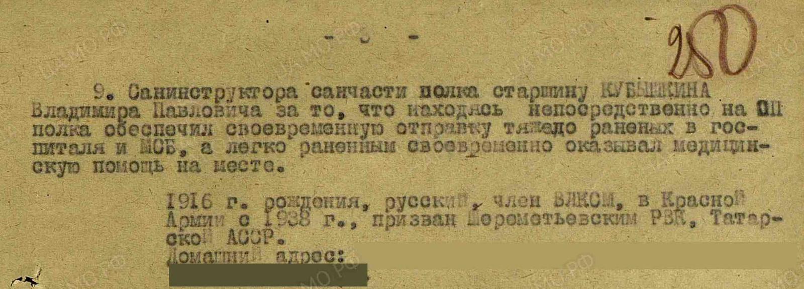 КУБЫШКИН Владимир Павлович, 1916, с. Лебедино. Призван в РККА в сент. 1938 Шереметьевским РВК. Срочную службу проходил в стрелковой части. Сержант. Член ВЛКСМ. С июня 1941воевал на Западном фронте в составе 150 МинП. Участник обороны Москвы. После первого ранения в нояб. 1941, окончил школу санинструкторов. В марте 1943 перенёс второе ранение, 6 нояб. 1943 – третье ранение. С дек. 1943 – старшина медицинской службы, санинструктор санчасти 138 Корп. ПАП 23 А/ 21 А/ 8 А/ 2 УдА/ в составе Ленинградского и 2 Белорусского фронта. Участник освобождения Прибалтики и Польши. Награждён медалями «За отвагу», «За боевые заслуги», «За оборону Москвы». Демобилизован 20 окт. 1945.