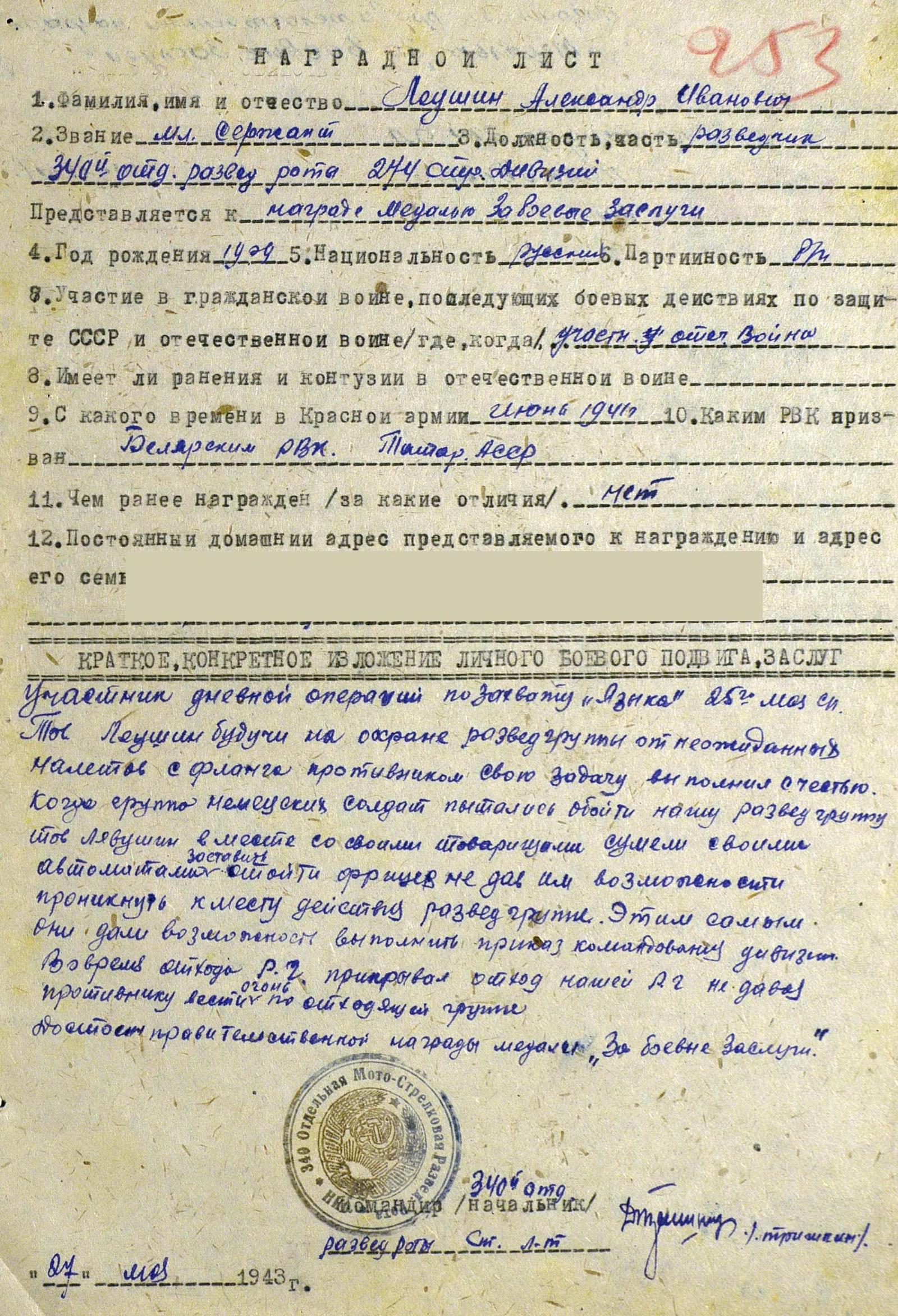 ЛЕУШИН Александр Иванович, 1909, с. Русская Мараса. По разным документам мобилизован Билярским, Нижне-Тагильским (вероятно после ранения) или Красноауральским РВК в начале июля 1941 г. В ходе войны получил 6 боевых наград и несколько ранений. Служил разведчиком, мл. сержант 340 отдельной мото-стрелковой разведроты 274 стрелковой дивизии 61 и 65 стрелкового корпуса 33 и 69 Армии Западного и 1 Белорусского фронта. Неоднократно ходил в разведгруппе за "языком", лично уничтожил в боях автоматным огнём, гранатами и в рукопашной несколько десятков немцев. После ранений всегда возвращался в свою роту и продолжал воевать. Несколько раз ошибочно был учтён как пропавший без вести. Награждён медалями "За боевые заслуги" (1943), "За отвагу" (1945), орденами Красной Звезды, Отечественной войны 2 ст., Славы 2 и 3 степени (все в 1944 г.). Послевоенная судьба неизвестна.