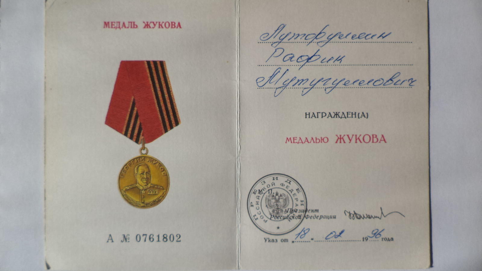 Рафик Мутигуллович является участником Великой Отечественной войны, инвалидом 2 группы от общего заболевания, реабилитирован от политических репрессий.