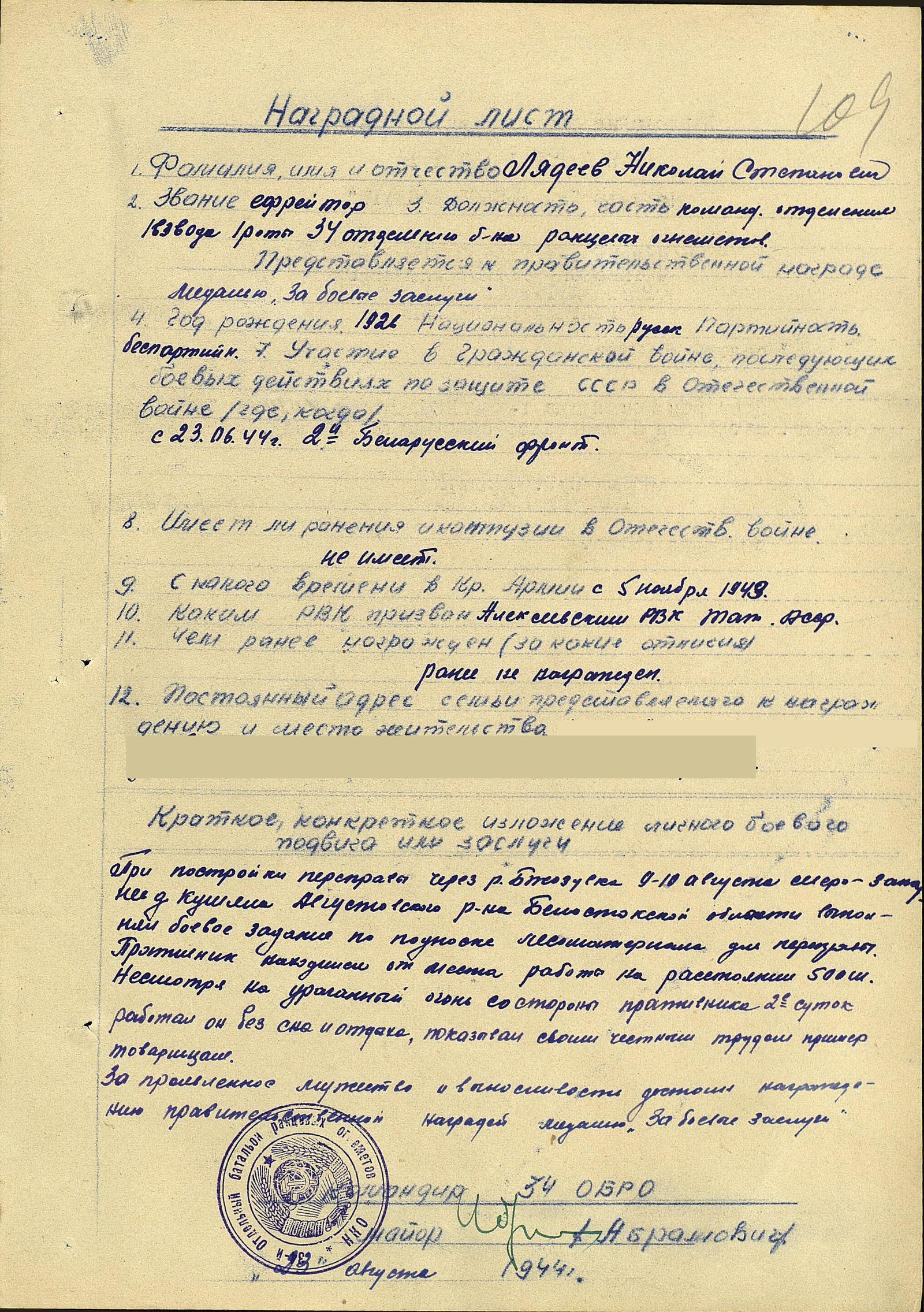 ЛЯДЕЕВ Николай Степанович, 1926, д. Бутлеровка. До призыва в армию работал в к-зе "Им. Молотова". Мобилизован Алексеевским РВК 5 нояб. 1943. Ефрейтор/ мл. сержант, ком. сапёрного отделения 34 отд. батальона ранцевых огнемётов 1 гв. штурмовой инженерно-сапёрной бригады в составе 50 А/ 48 А/ 2 УдА/ 70 А 2 Белорусского фронта. Участник освобождения Белоруссии и Польши. Демобилизован 9 мая 1951. Работал зав. гаражом к-за "Родина". Награждён медалью "За боевые заслуги", орденом Отечественной войны 2 ст. (1985).