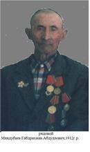 Миндубаев Габдрахман Абдуллович родился в 1912 году в с.Каргополь Алькеевского района ТАССР. Фронтовик. Участник Великой Отечественной войны 1941-1945гг. Призван Алькеевским РВК ТатАССР . (Фотография и материалы предоставлены Каргопольским сельским поселением)
