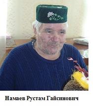 Намаев Рустам Гайсинович родился 23 сентября 1929 года в Алькеевском районе в деревне Каропаль. Когда началась война, Рустаму было 12 лет. Окончил 4 класса, в 5 классе проучился одну неделю, так как началась война. Учебу бросил, пошел работать пастухом, потом работал на Алатском спиртзаводе (в Алаты семья переехала перед войной в 1938году). 12 лет проработал на этом предприятии.