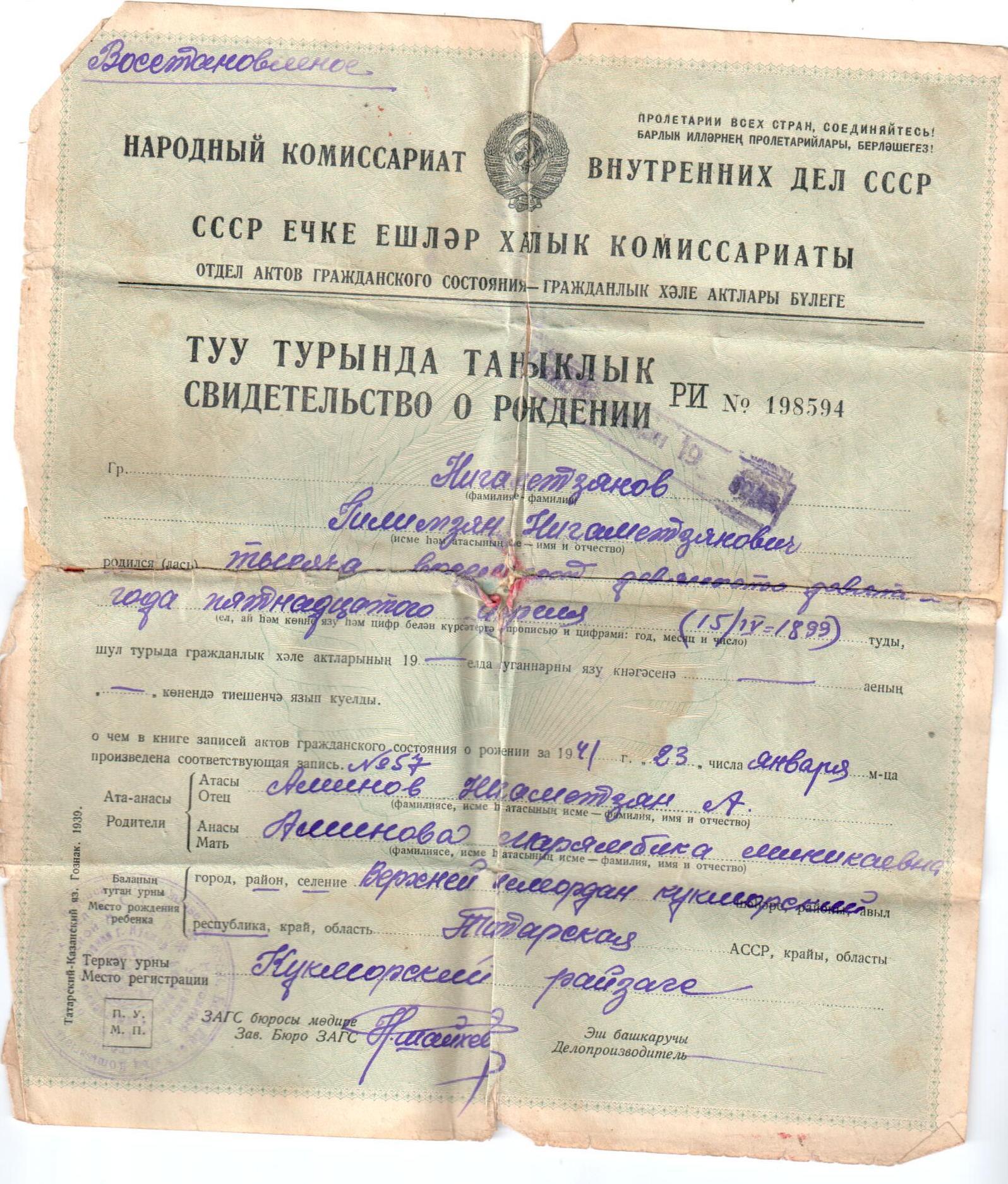 Нигаметзянов Гилимзян Нигаметзянович родился 15 апреля 1899 года в деревне Верхний Шемордан Тат АССР. Во время гражданской войны воевал против Диникина в конных войсках. Вернувшись после войны работал в колхозе. С апреля 1942 по ноябрь 1944 годы воевал в Великой Отечественной войне. Служил старшим пулеметчиком. С войны вернулся с ранением плеча. Умер в 69 лет, 15 ноября 1968 года.