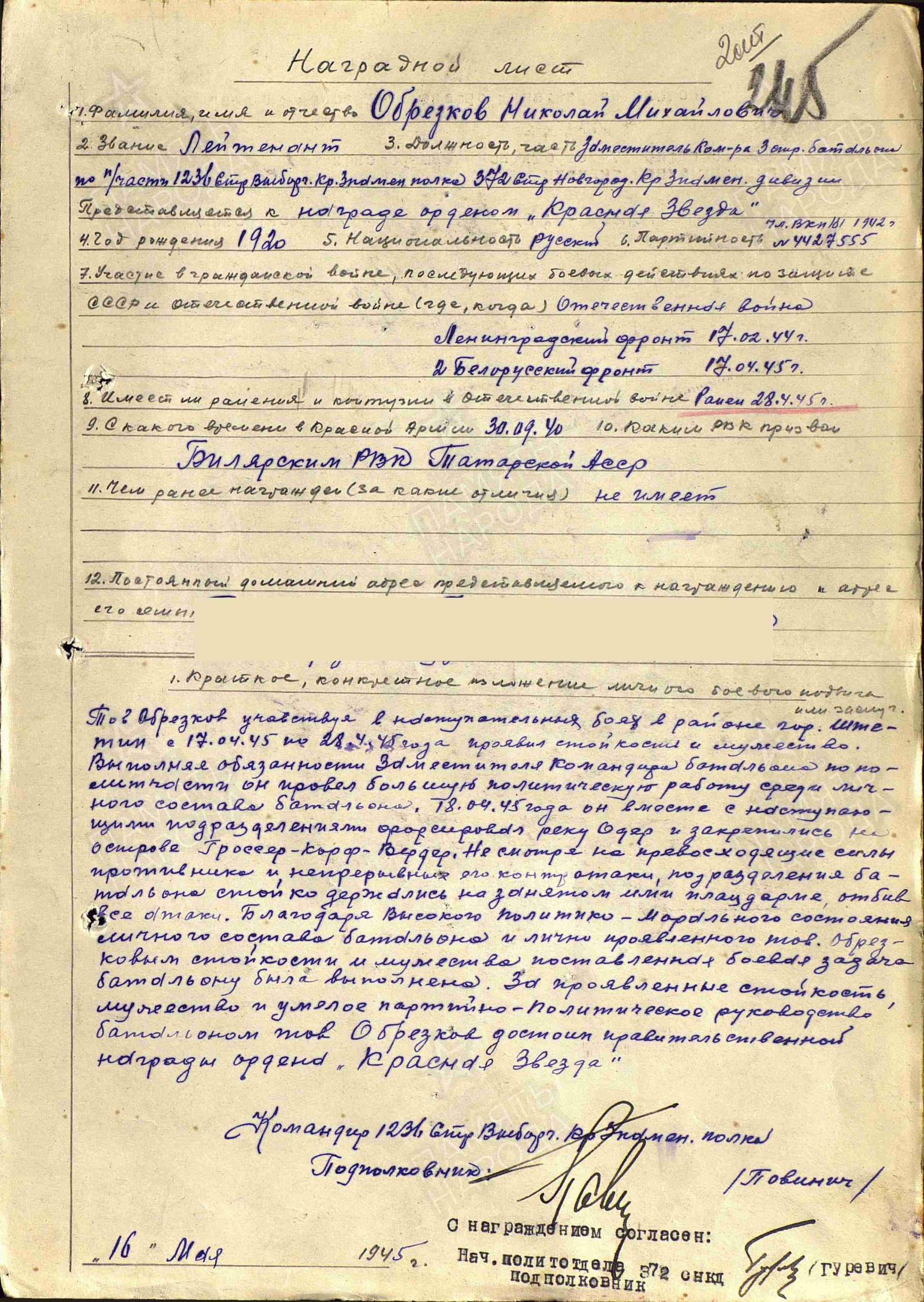 ОБРЕЗКОВ Николай Михайлович, 1920, с. Билярск. Призван 30 сент. 1940 Билярским РВК. Окончил военное училище. Член ВКП(б) с 1942. В 1945 – лейтенант, зам. ком. батальона по политической части 1236 СП 372 СД 2 УдА Ленинградского/ 2 Белорусского фронта. Принимал участие в освобождении Польши, форсировании р. Одер. 28 апр. 1945 получил тяжёлое ранение. Проходил лечение в ЭГ 5364 до 22 авг. 1945. После войны служил в Забайкалье. Вышел в отставку 13 окт. 1957 в звании «капитан». Награждён орденами Отечественной войны 2 ст. (1945), Отечественной войны 1 ст. (1985).