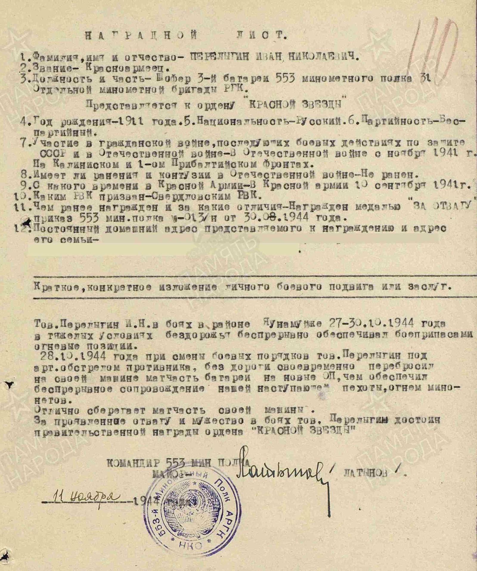 ПЕРЕЛЫГИН Иван Николаевич, 1911, с. Билярск. Мобилизован 10 сент. 1941 Свердловским ГВК г. Свердловск. Воевал на Калининском, 1 Прибалтийском, 2 Прибалтийском, Ленинградском фронте в составе 22 А/ 39 А/ 43 А/ 4 УдА/ 6 гв. А/ 11 гв. А/ 2 гв. А/ 1 УдА. Красноармеец, шофёр дивизиона 553 МинП 31 отд. МинБр. Награждён медалью «За отвагу», орденом Красной Звезды.