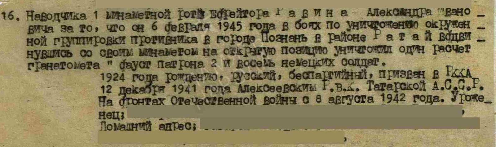 РАВИН Александр Иванович, 1924, с. Лебяжье. Мобилизован 25 авг. 1942 Алексеевским РВК. На фронте с авг. 1943. Красноармеец, ефрейтор, подносчик, наводчик 82 мм миномёта 1079 СП 312 СД 5 А/ 10 гв. А Западного и 2 Прибалтийского фронта, 69 А 1 Белорусского фронта. Легко ранен в левую ногу 9 авг. 1943. Награждён двумя медалями «За отвагу», орденом Отечественной войны 2 ст. (1985). После окончания боёв служил шофёром а/м ЗИС-5. Демобилизован 24 фев. 1947. Работал бригадиром тракторной бригады к-за «Родина». Скончался в 1994.