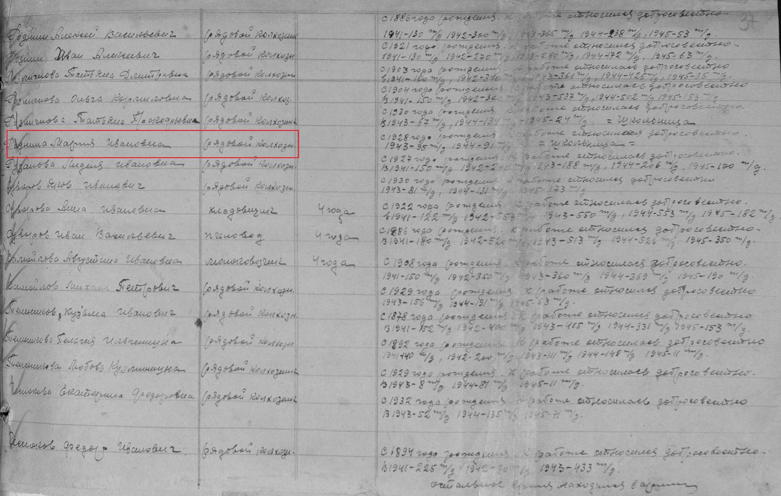 Роднина Мария Ивановна родилась в 1928 году. Место жительства: п. Елховка Ново-Шешминский район ТАССР. В годы Великой Отечественной войны работала в колхозе им. Ворошилова рядовой колхозницей. Награждена медалью "За доблестный труд в Великой Отечественной войне 1941–1945 гг." (Акт от 28 апреля 1947 г, фонд 3610, опись 2, дело № 325, лист 37).