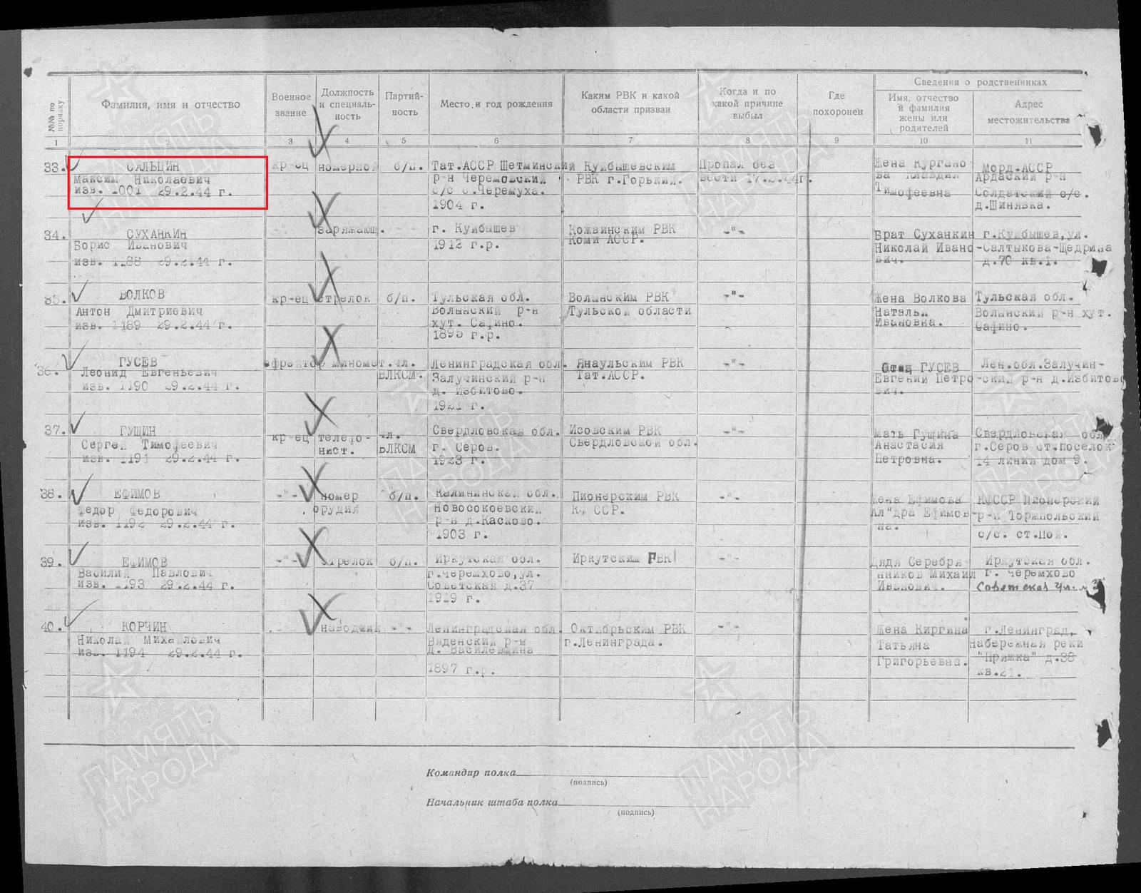 САЛЬЦИН МАКСИМ НИКОЛАЕВИЧ родился в 1904 году в с.Сл.Черемуховая Казанской губернии Чистопольского уезда Новошешминской волости. (ныне с.Слобода Черемуховая Новошешминского района РТ). Мобилизован Куйбышевским РВК г.Горького,кр-ц,109 сд,штаб. Пропал без вести 17.02.44.г. Область выбытия: Эстония, Нарвский р-н.