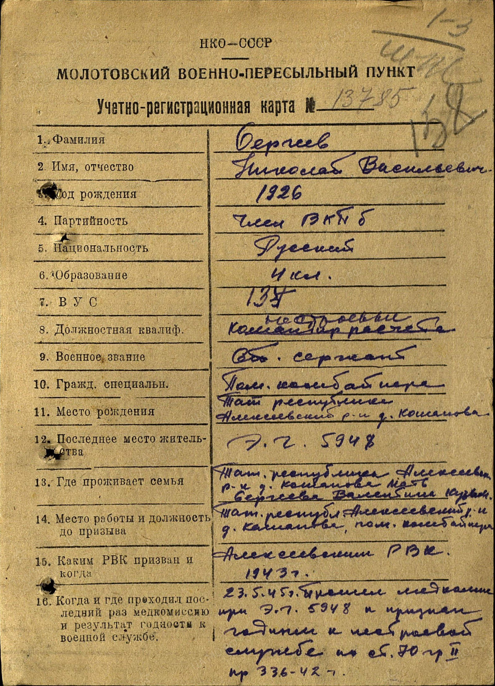 СЕРГЕЕВ Николай Васильевич, 1926, д. Кошаново. Член ВЛКСМ/ВКП(б). Мобилизован Алексеевским РВК 5 нояб. 1943. На фронте с мая 1944. Гв. сержант, наводчик 45 мм пушки, ком. отделения 56 гв. СП 19 гв. СД 39 А 3 БелФ. 19 янв. 1945 при отражении сильной контратаки противника, вместе со своим отделением сумел удержать рубеж, нанести ощутимые потери врагу в живой силе. В бою был ранен и контужен. Награждён медалями «За отвагу», "За боевые заслуги", орденом Славы 3 ст. Проходил лечение в ЭГ 5948 в г. Чусовой, Молотовской обл. В мае 1945 признан годным к нестроевой службе и направлен в геологоразведочную экспедицию.