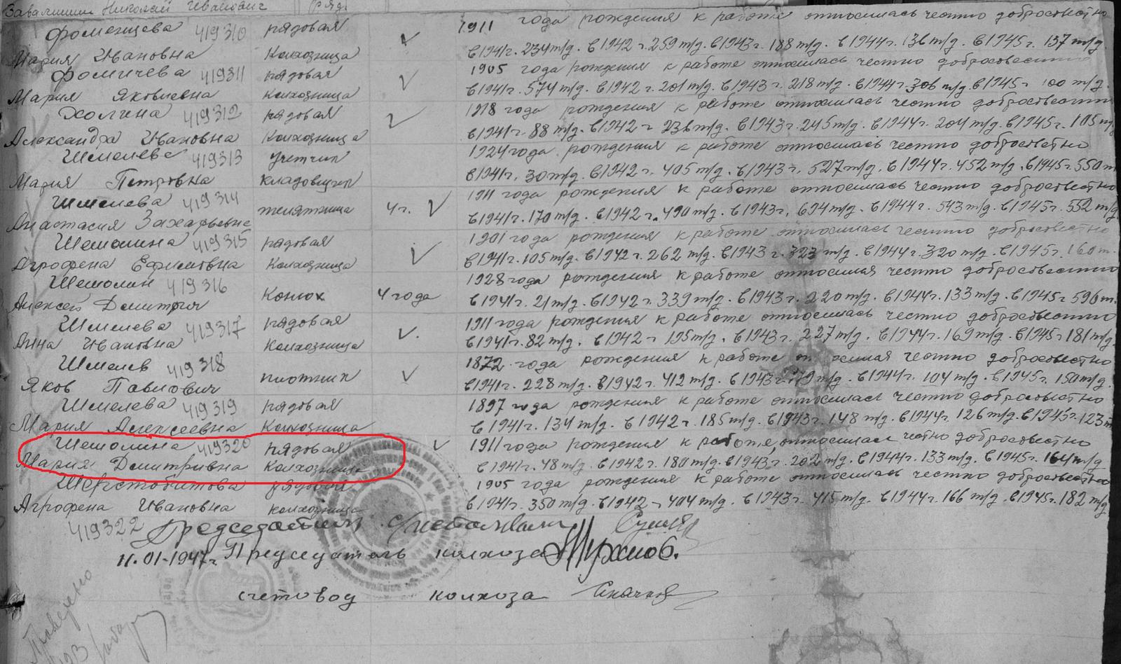 Шешолина Мария Дмитриевна родилась в 1911 году в с.Новошешминск Казанской губернии Чистопольского уезда Новошешминской волости. В годы Великой Отечественной войны работала в колхозе «Красный Октябрь» рядовой колхозницей. Награждена медалью "За доблестный труд в Великой Отечественной войне 1941–1945 гг." (Акт от 28 апреля 1947 г, фонд 3610, опись 2, дело № 325, лист 35, № 419320). Умерла в 1980 году, похоронена на сельском кладбище с.Новошешминск.