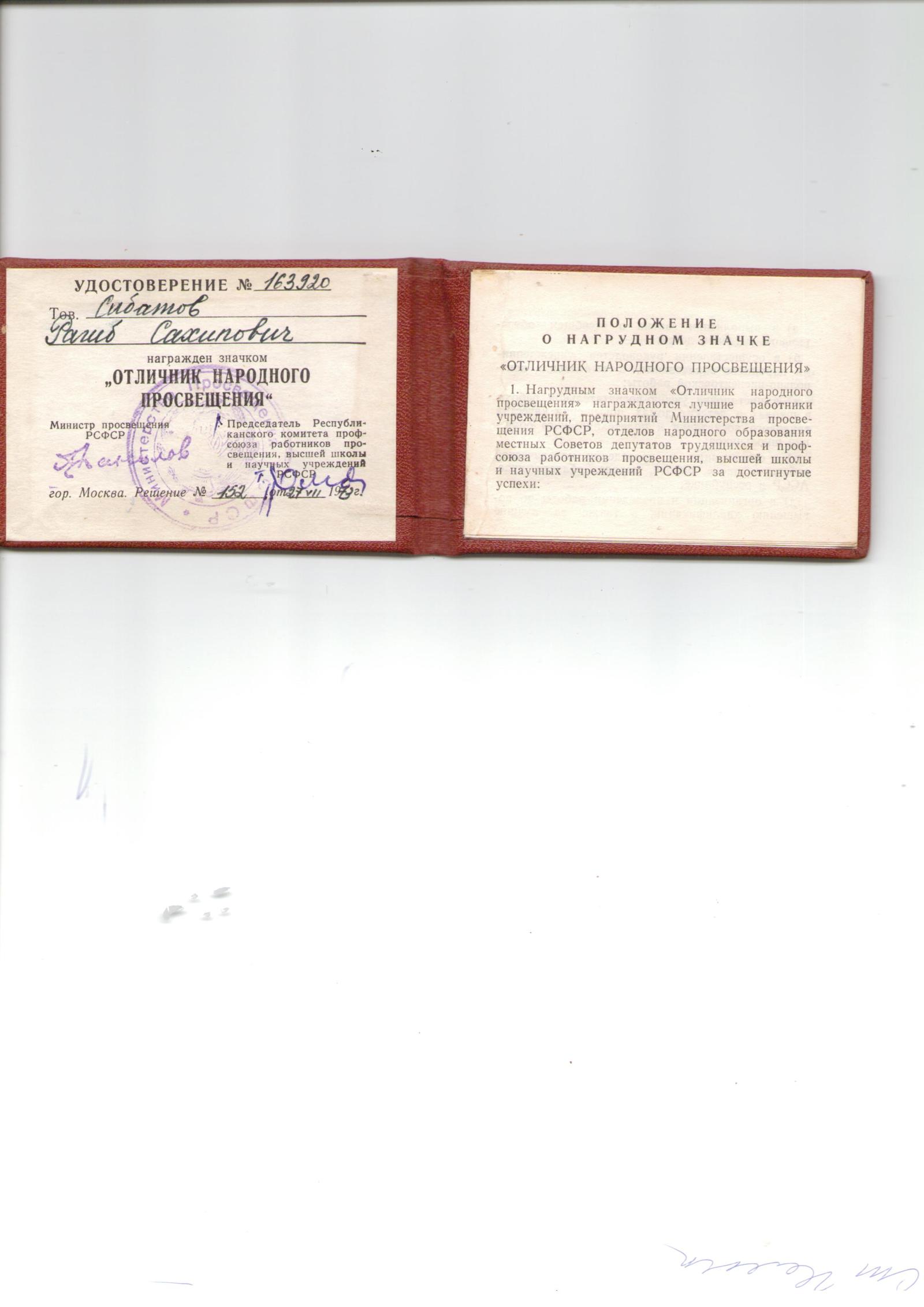 1973 г. - "Отличник народного просвещения",1984 г. - "Отличник просвещения СССР",1999 г. - ветеран труда.