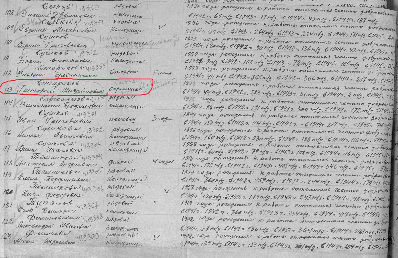 Стариков Григорий Михайлович родился в 1892 году. Место жительства: с.Ново-Шешминск Ново-Шешминский район ТАССР. В годы Великой Отечественной войны работал в колхозе «Красный Октябрь» охранником. Награжден медалью "За доблестный труд в Великой Отечественной войне 1941–1945 гг." (Акт от 28 апреля 1947 г, фонд 3610, опись 2, дело № 325, лист 34).