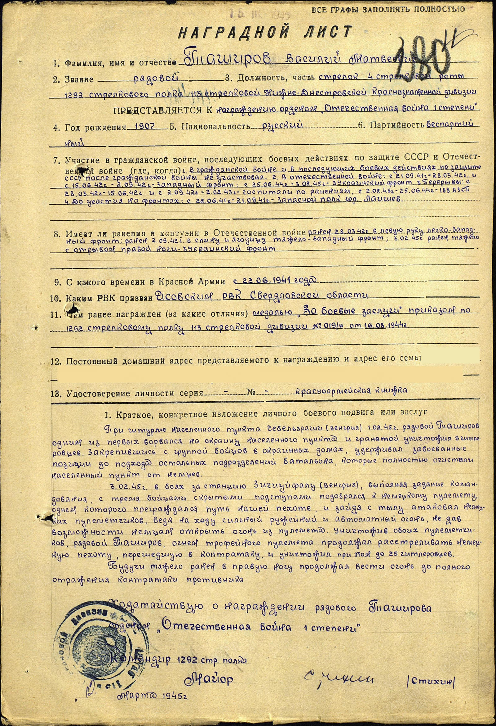 ТАШИРОВ Василий Матвеевич, 1907, с. Билярск. Мобилизован Исовским РВК Свердловской обл. 22 июня 1941. До сент. 1941 находился в запасном полку в г. Лаишев. Воевал на ЗапФ и 3 УкрФ. Участник боёв за г. Ржев в составе 418 СП 133 СД 31 А. Был легко ранен 28 марта 1942 осколком в левую руку, тяжело ранен 2 сент. 1942 в спину (плечо) и ягодицу. Красноармеец, стрелок, пом. наводчика пулемёта 1292 СП 113 СД 57 А и 4 гв. А. В боях на территории Венгрии, 1 фев. 1945, одним из первых ворвался в н.п. Гебельяраши, гранатами уничтожил пять гитлеровцев. 3 фев. 1945, в бою за ст. Зичуйфалу, с тремя бойцами подобрался к немецкому пулемёту, атаковал его, уничтожил расчёт, использовав трофейный пулемёт, отбил контратаку врага, уничтожив до 25 немецких солдат. При этом был тяжело ранен в правую ногу. Представлена к ордену Отечественной войны 1 ст. Награждён медалью «За боевые заслуги», орденом Славы 3 ст.