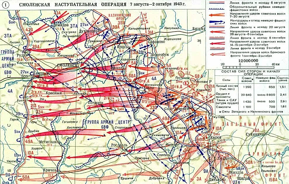 Смоленская наступательная операция. Западный фронт. 31-я армия (В. А. Глуздовский) использовала для прорыва обороны противника 42-ю гвардейскую танковую бригаду. Противник обнаружил подход танков к переднему краю и в течение 14 часов обстреливал район сосредоточения бригады. Переход с утра 10 августа в наступление советских войск на этом направлении не привел к успеху. Пехота и танки понесли большие потери.