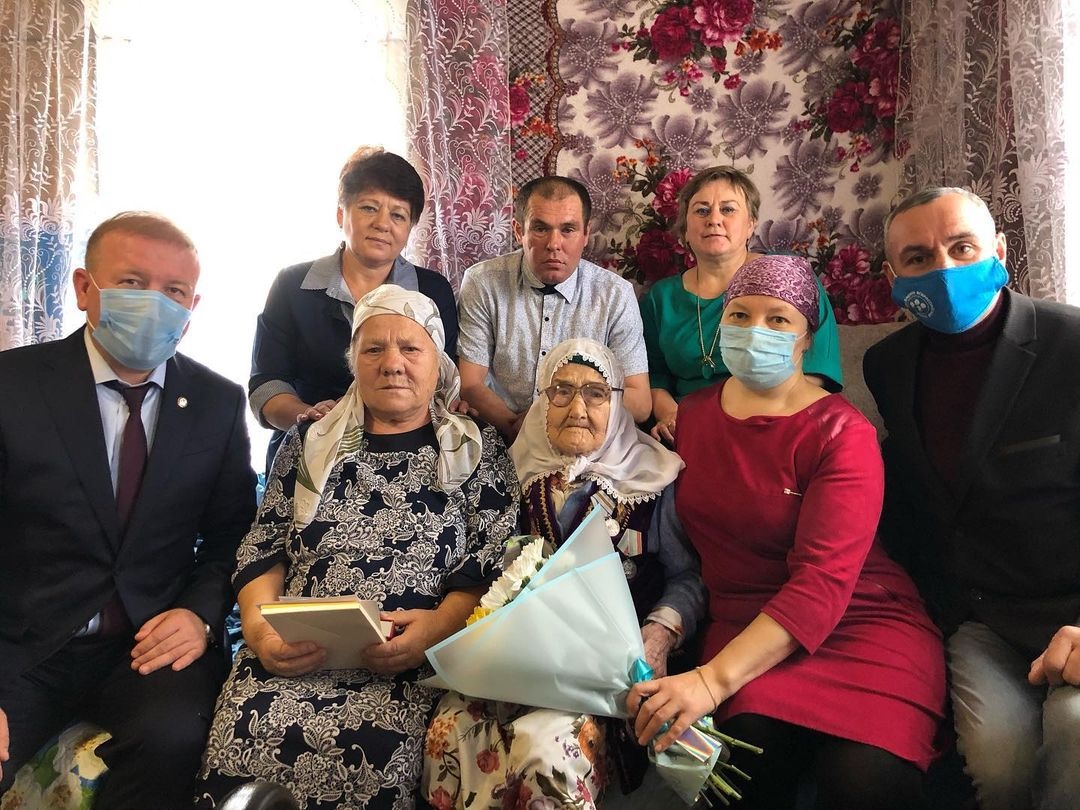 С вековым юбилеем Шерифзямал Замалетдиновну поздравил Глава района Марат Гафаров. Он вручил ей Поздравления от имени Президентов РФ и РТ, а также медали и подарки. Пожелал бодрости духа и здоровья, выразил слова благодарности за труд.